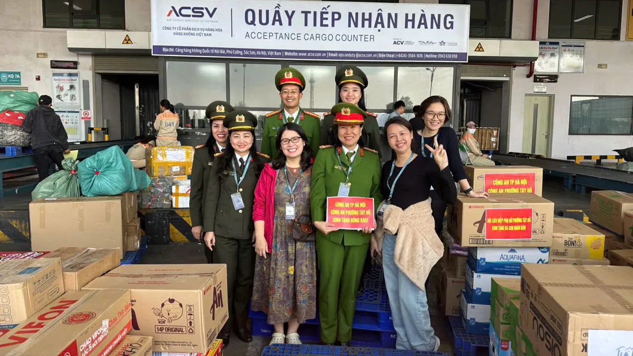 Sáng ngày 23/11, các hàng hoá nhu yếu phẩm đã được Công an phường Tây Hồ vận chuyển ra sân bay để chuyển đến Nhân dân vùng lũ.