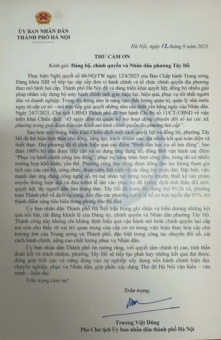 Thư cảm ơn của UBND thành phố Hà Nội gửi đến Đảng bộ, chính quyền và Nhân dân phường Tây Hồ.
