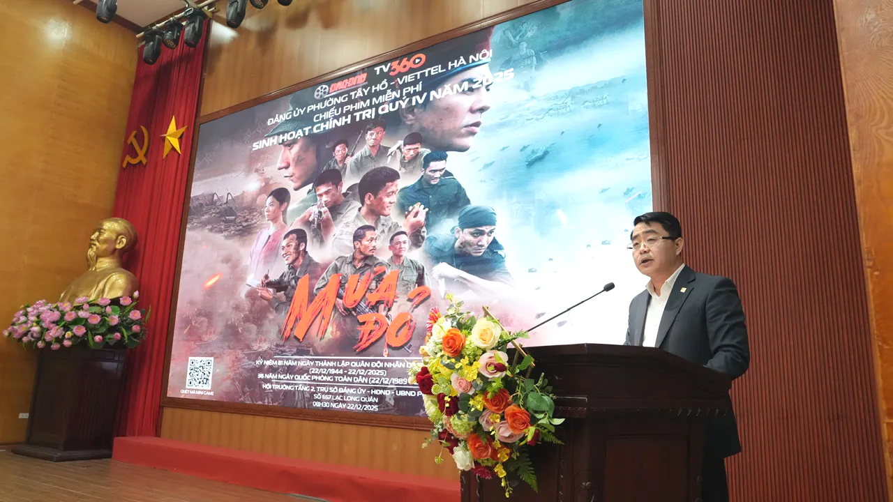 Kinhtedothi – Ngày 22/12, nhân kỷ niệm 81 năm Ngày thành lập Quân đội Nhân dân Việt Nam (22/12/1944 - 22/12/2025) và 36 năm Ngày hội Quốc phòng toàn dân, Đảng ủy phường phối hợp với Viettel Hà Nội và Viettel Tây Hồ tổ chức buổi sinh hoạt chính trị quý IV/2025 qua hình thức xem phim "Mưa đỏ".