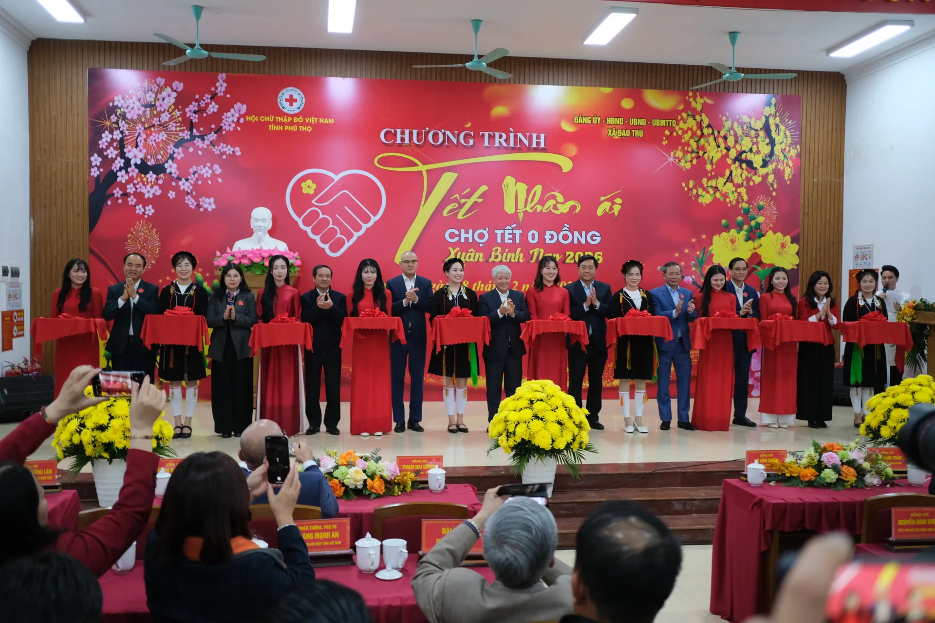 Phó Chủ tịch Thường trực Quốc hội Đỗ Văn Chiến và Bí thư Tỉnh ủy Phú Thọ Phạm Đại Dương cắt băng khai mạc Chợ Tết 0 đồng Xuân Bính Ngọ 2026. Ảnh: Sỹ Hào