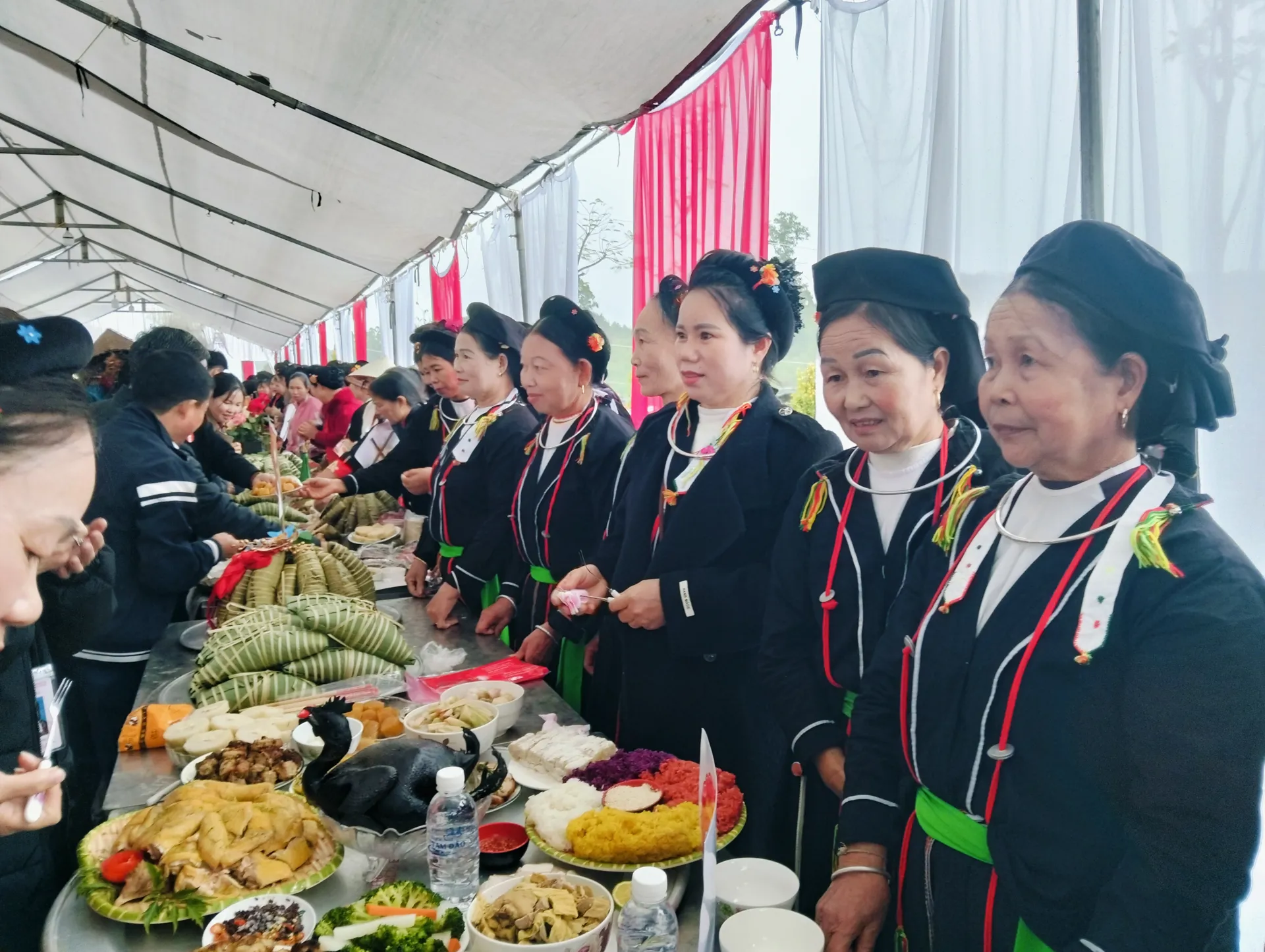 Không gian trưng bày giới thiệu cỗ Tết truyền thống của đồng bào dân tộc Sán Dìu, thết đãi khách tham dự chương trình Tết Nhân ái. Ảnh: Sỹ Hào