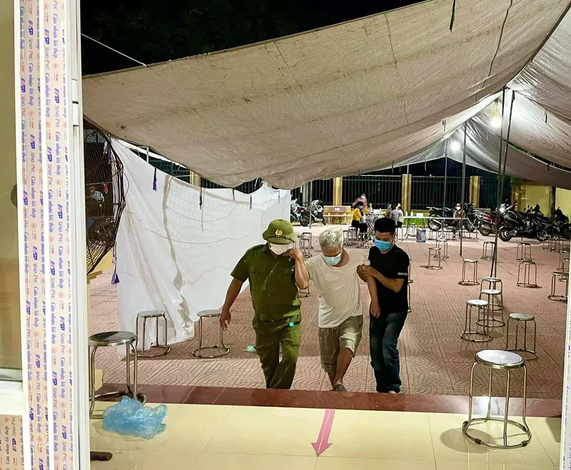 Lực lượng hỗ trợ tiêm phòng hướng dẫn và giúp người dân vào khu vực tiêm.