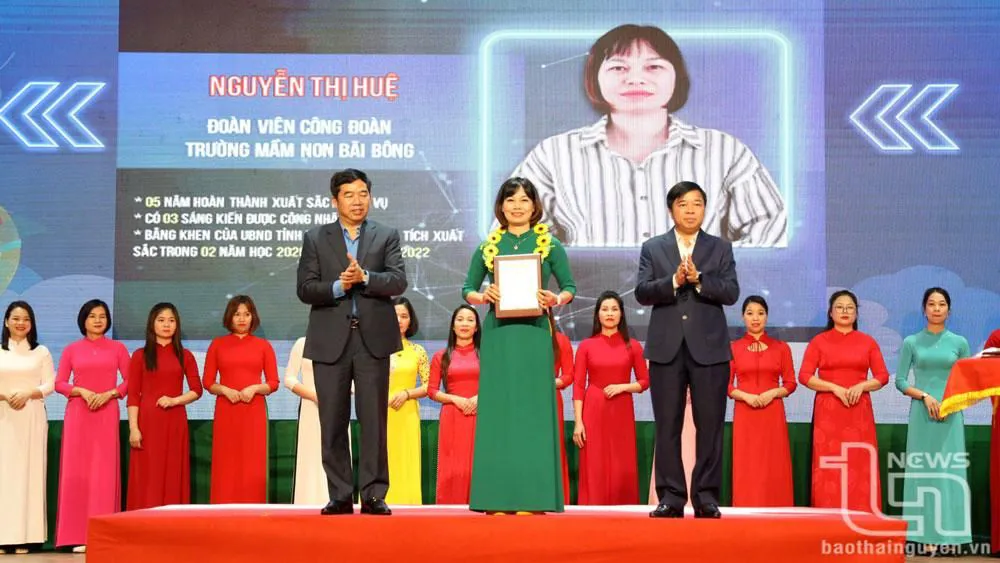 Đồng chí Bùi Văn Lương và đại diện lãnh đạo Liên đoàn Lao động tỉnh tôn vinh công nhân, viên chức, người lao động tiêu biểu trong các phong trào thi đua giai đoạn 2020 - 2025. Ảnh: Báo Thái Nguyên