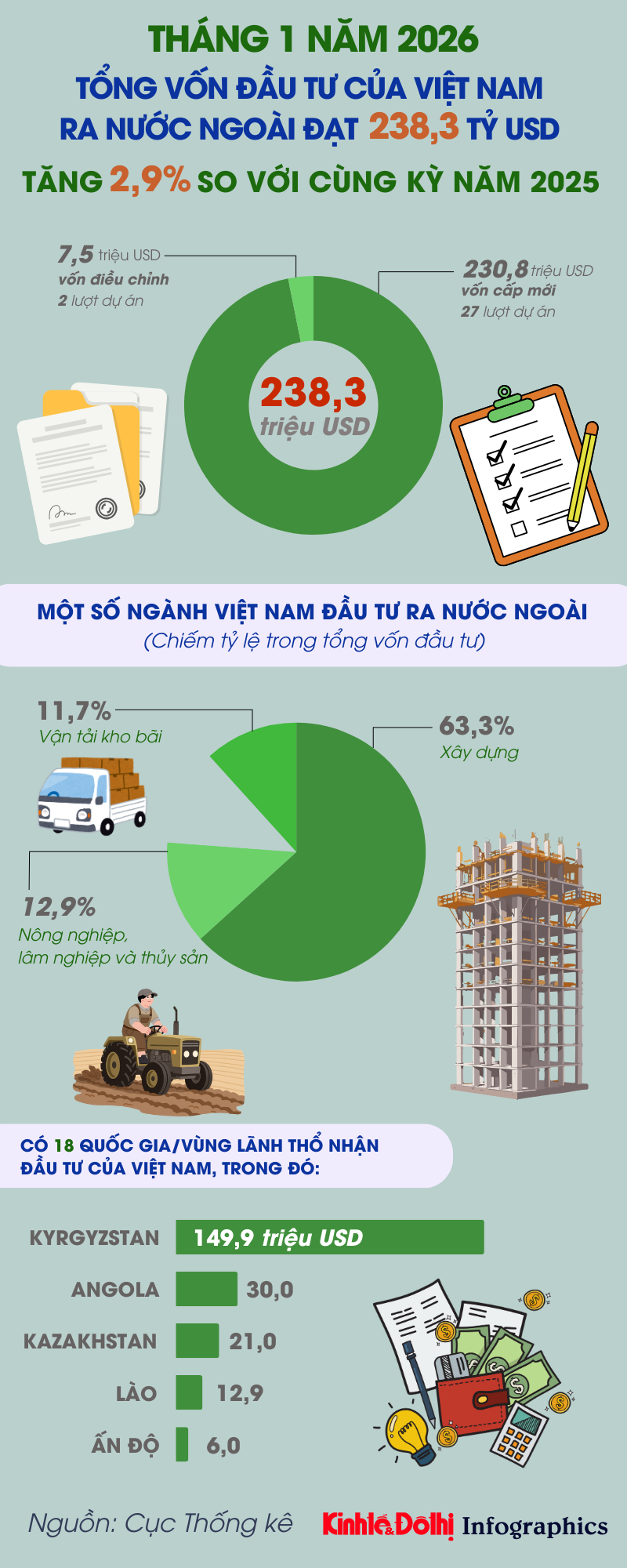 Tháng 1/2026: Đầu tư của Việt Nam ra nước ngoài đạt 238,3 triệu USD