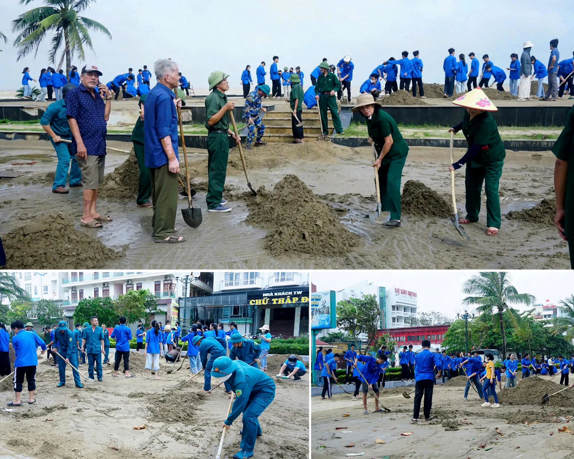 Người dân cùng lực lượng chức năng phường Sầm Sơn dọn vệ sinh môi trường biển.