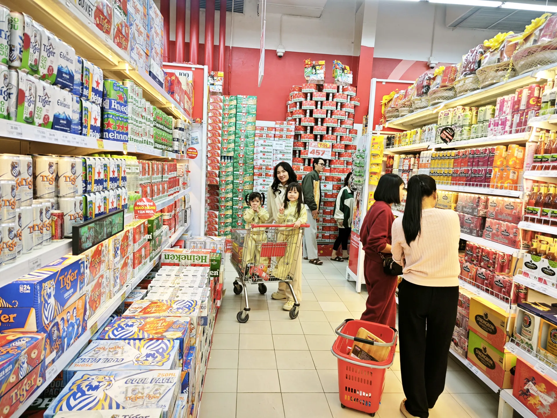 Hàng hóa phục vụ Tết được bày bán phong phú, đa dạng tại các siêu thị, đáp ứng nhu cầu mua sắm tăng cao của người dân.