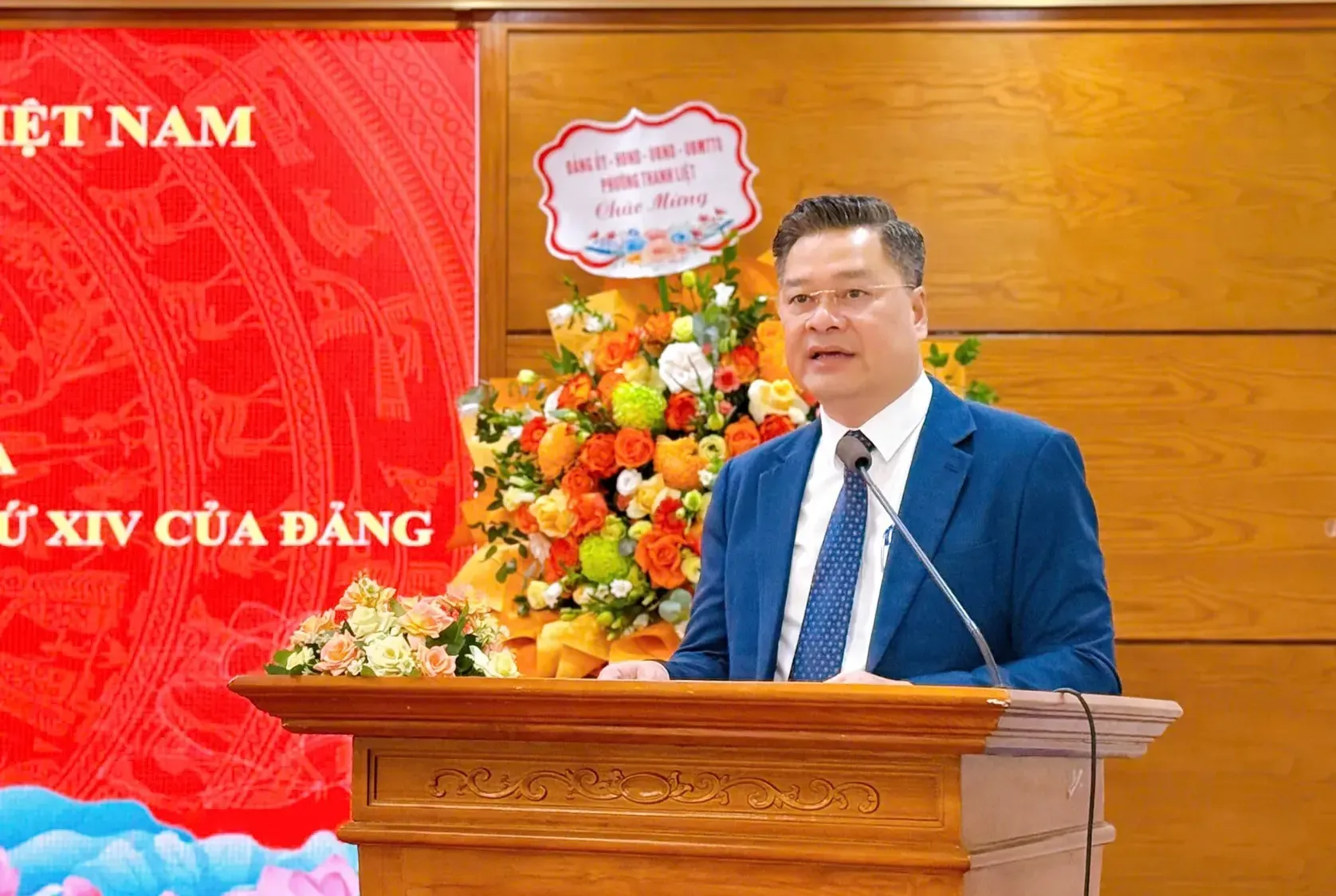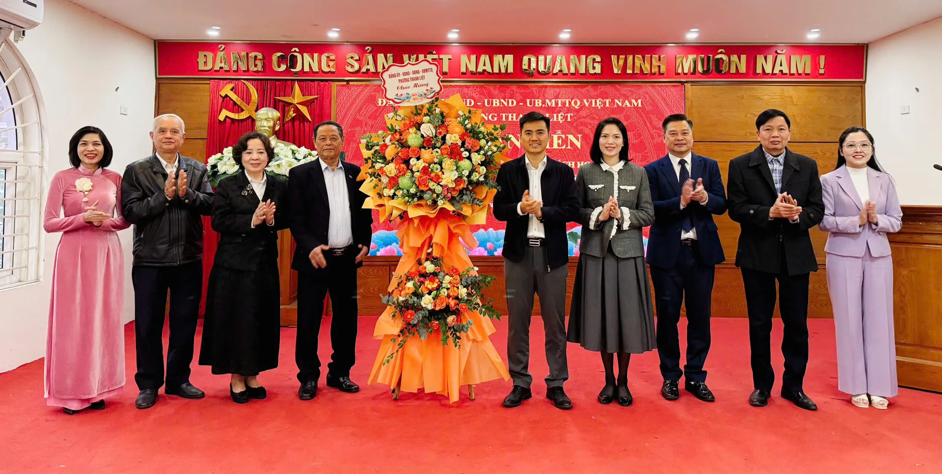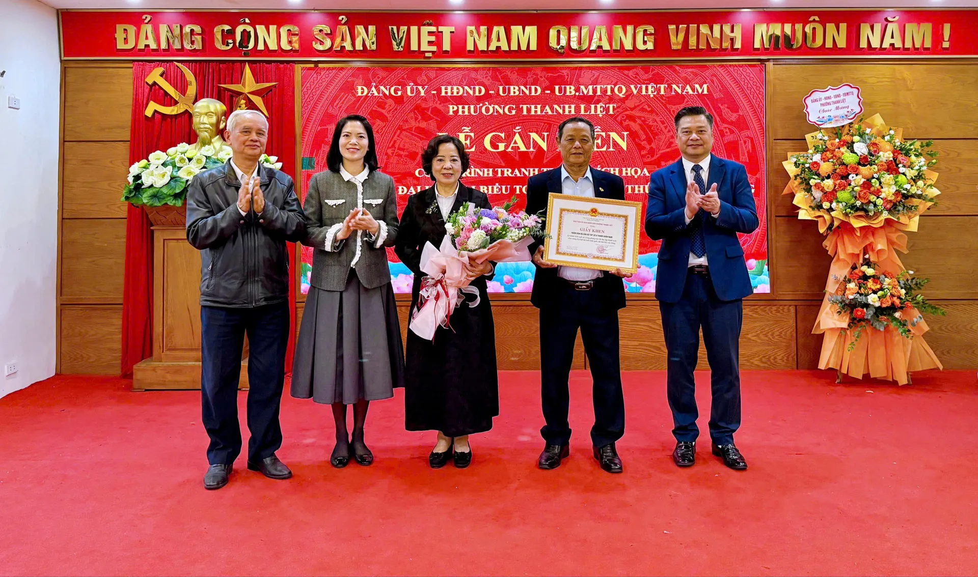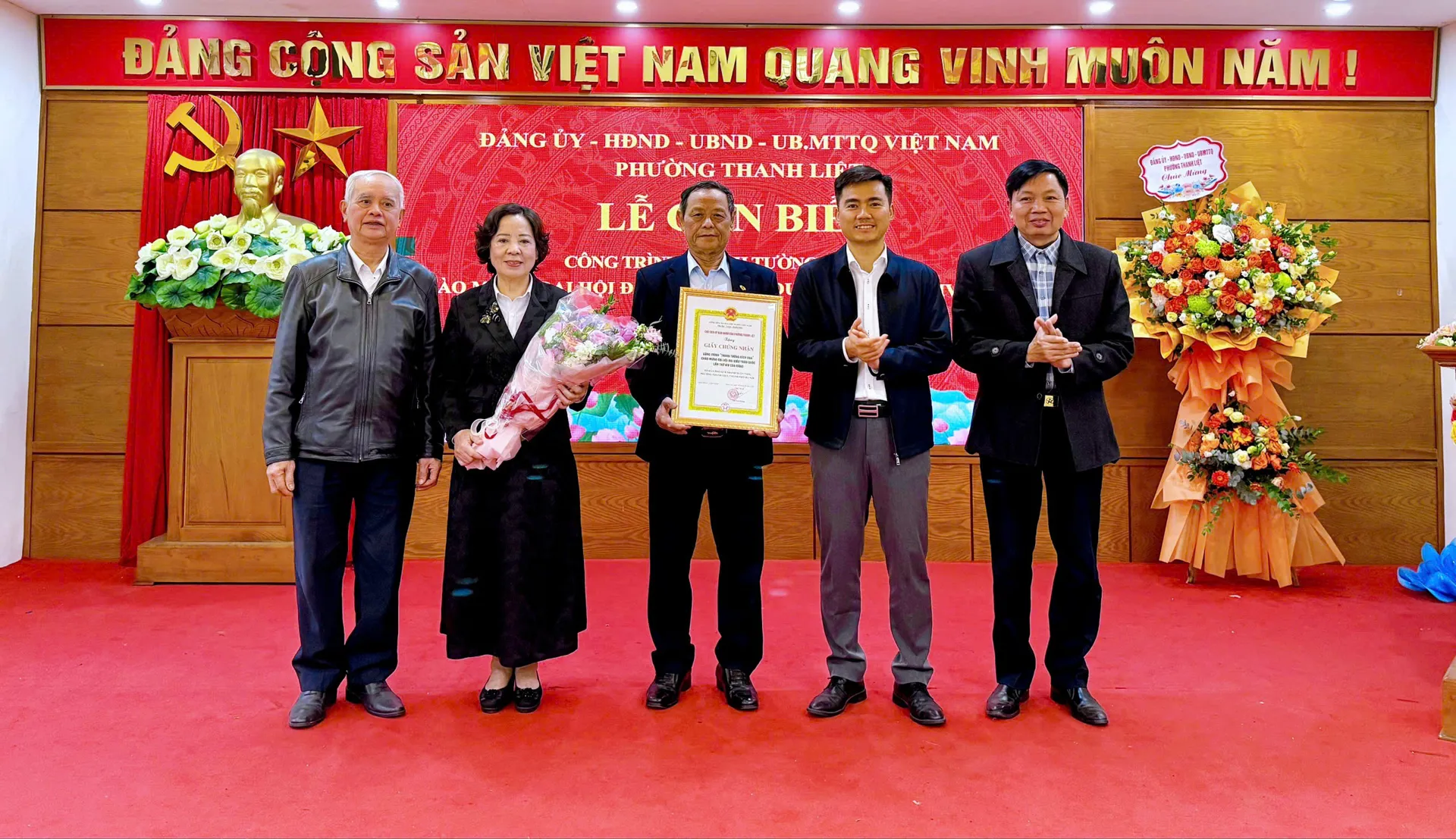 Lãnh đạo phường Thanh Liệt tặng hoa chúc mừng buổi lễ.
