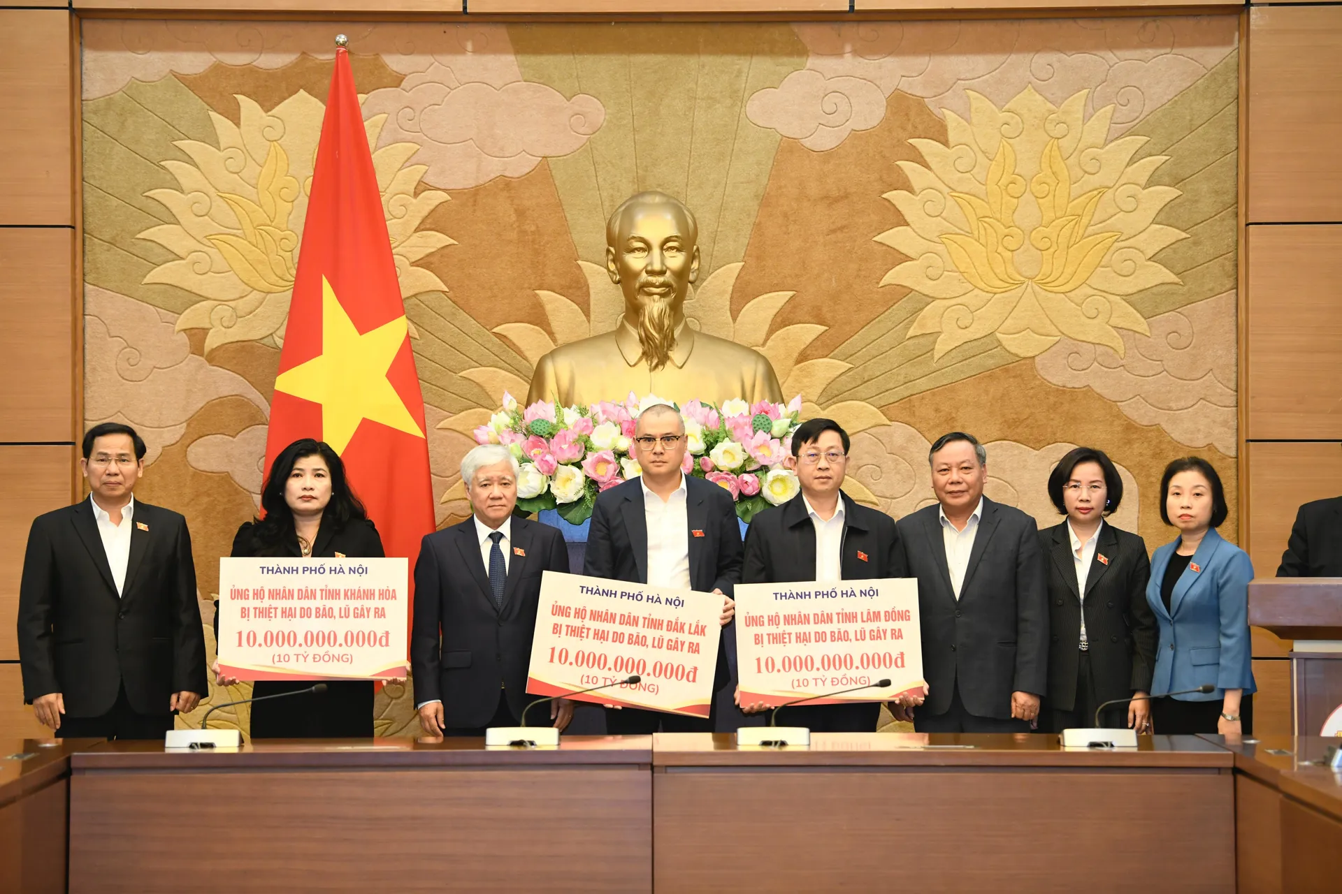 Kinhtedothi - Chiều 24/11, tại Nhà Quốc hội, hưởng ứng Lời kêu gọi của Đoàn Chủ tịch Ủy ban Trung ương MTTQ Việt Nam và tinh thần "Hà Nội vì cả nước, cùng cả nước", TP Hà Nội đã tổ chức trao tặng kinh phí hỗ trợ của thành phố cho các tỉnh: Đắk Lắk, Lâm Đồng, Khánh Hòa.