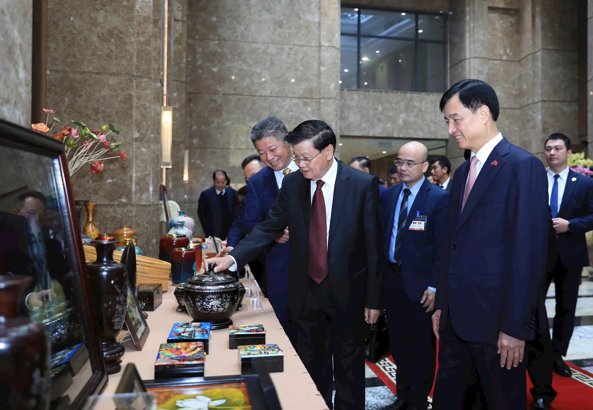 Các đồng chí lãnh đạo Đảng Nhân dân cách mạng Lào, Thành ủy Hà Nội tham quan không gian trưng bày sản phẩm thủ công mỹ nghệ của các làng nghề Thủ đô.