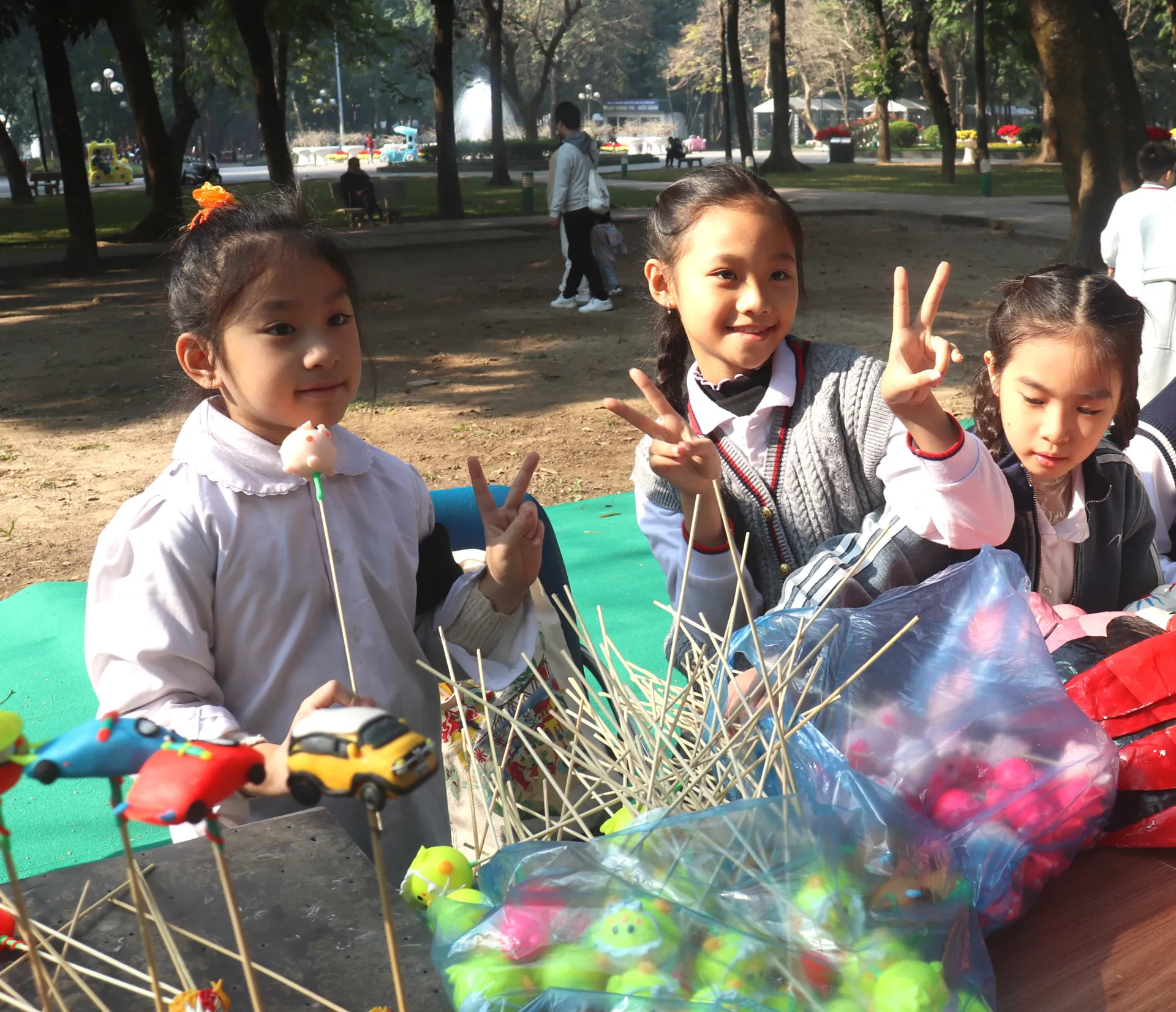 Các em nhỏ hứng thú với các trò chơi dân gian tại "Không gian sáng tạo" trong Công viên