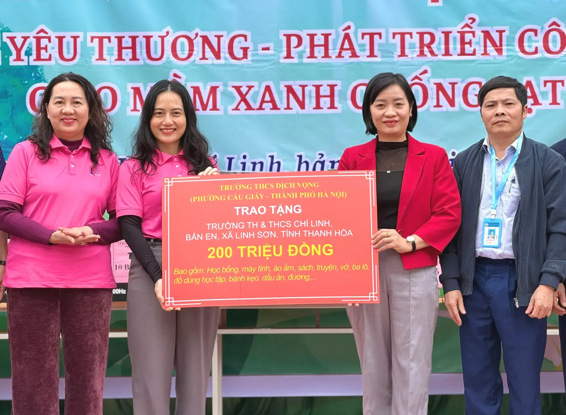 Ngày 5/2, đoàn công tác của Trường THCS Dịch Vọng đã đến thăm và tổ chức chương trình thiện nguyện tại Trường Tiểu học & THCS Chí Linh (bản En, xã Linh Sơn, tỉnh Thanh Hóa) với chủ đề “Chia sẻ yêu thương - Phát triển công nghệ số - Gieo mầm xanh chống sạt lở”. Chuyến đi mang theo tinh thần sẻ chia, trách nhiệm cộng đồng, đồng thời mong muốn tiếp thêm điều kiện học tập và niềm tin cho học sinh vùng còn nhiều khó khăn.