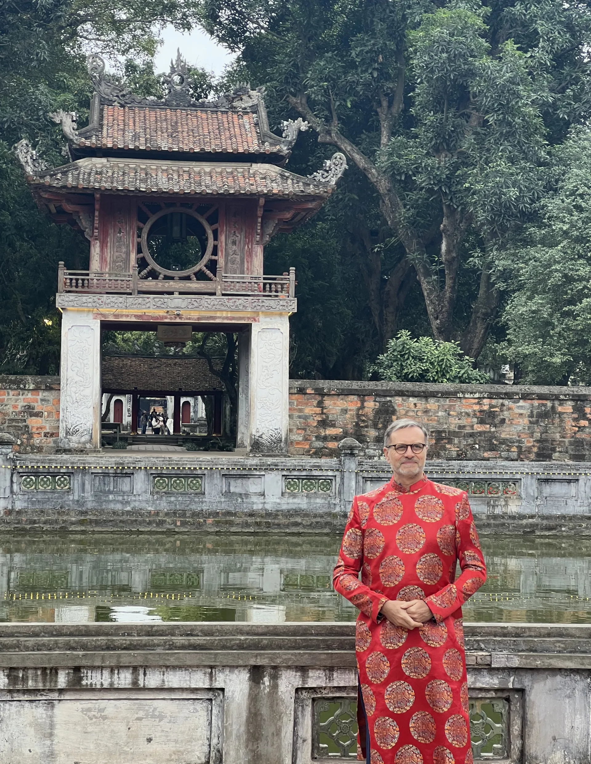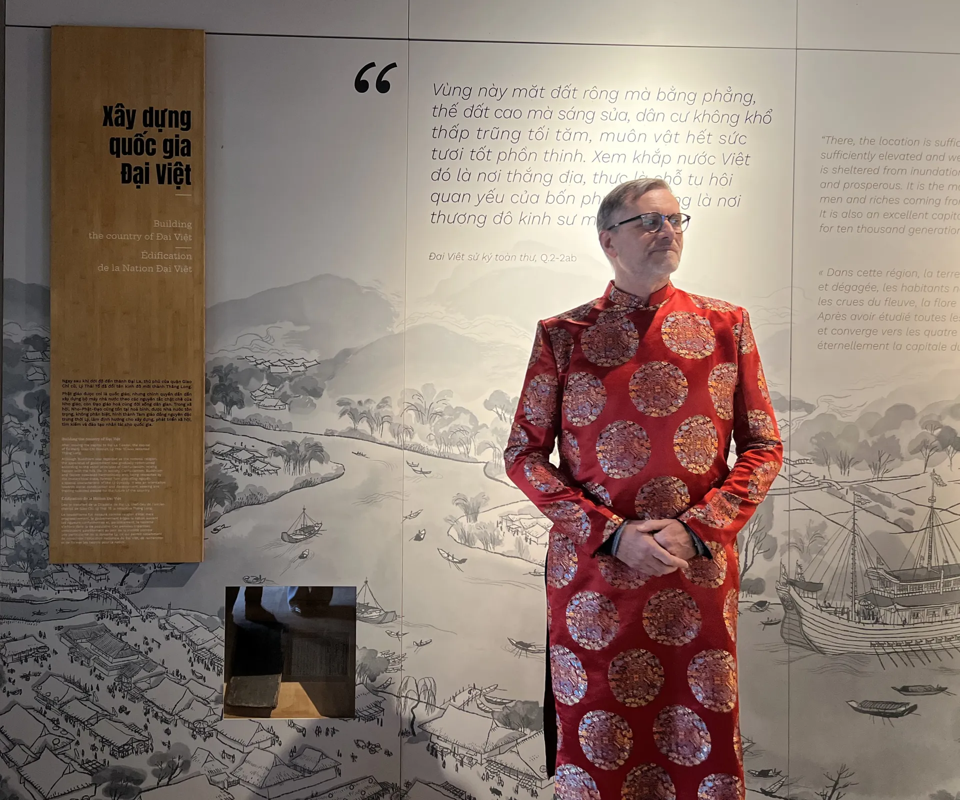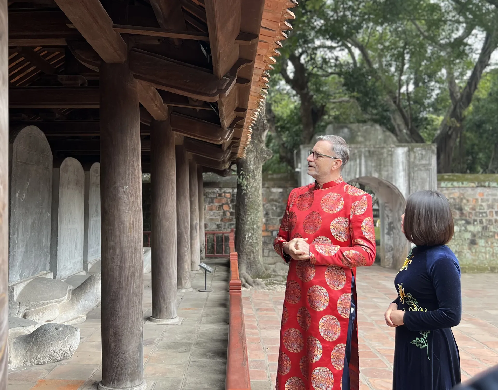 Trong tà áo dài truyền thống của Việt Nam, Đại sứ được nghe giới thiệu về lịch sử Văn Miếu - Quốc Tử Giám. Ông vô cùng thích thú khi được tìm hiểu về những kỳ thi Hương, kỳ thi Hội trong lịch sử, hay thăm mô phỏng lều chõng của học trò Việt Nam xưa được tái hiện ở Văn Miếu - Quốc Tử Giám.
