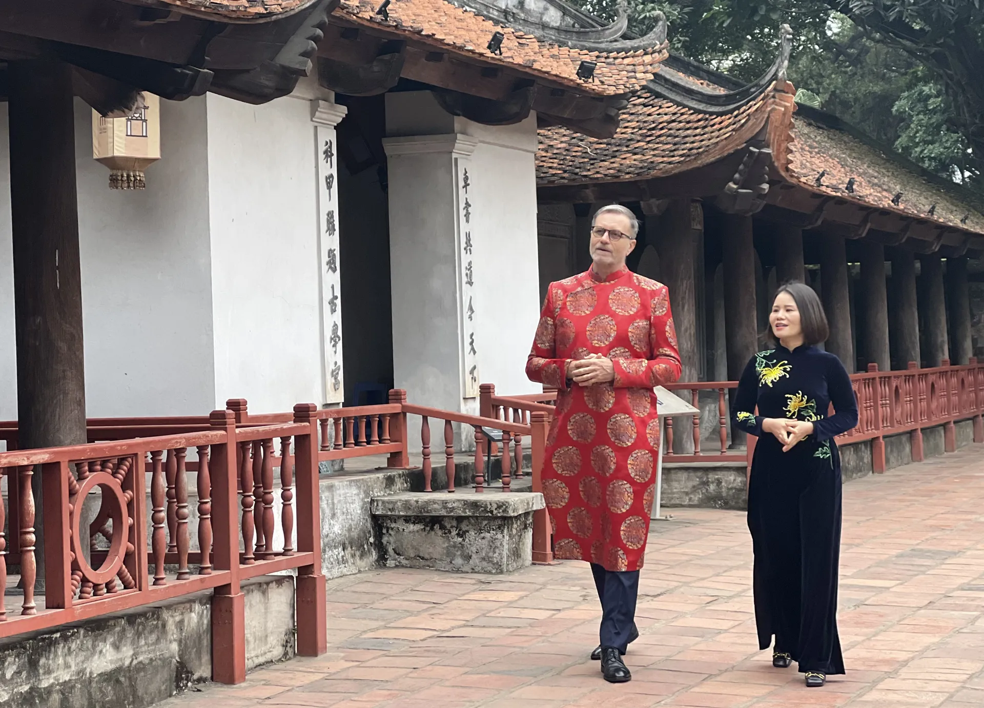 Đại sứ Pháp chọn Văn Miếu - Quốc Tử Giám làm điểm đến thăm khi Năm mới Bính Ngọ 2026 cận kề. Ảnh: Liên Hà