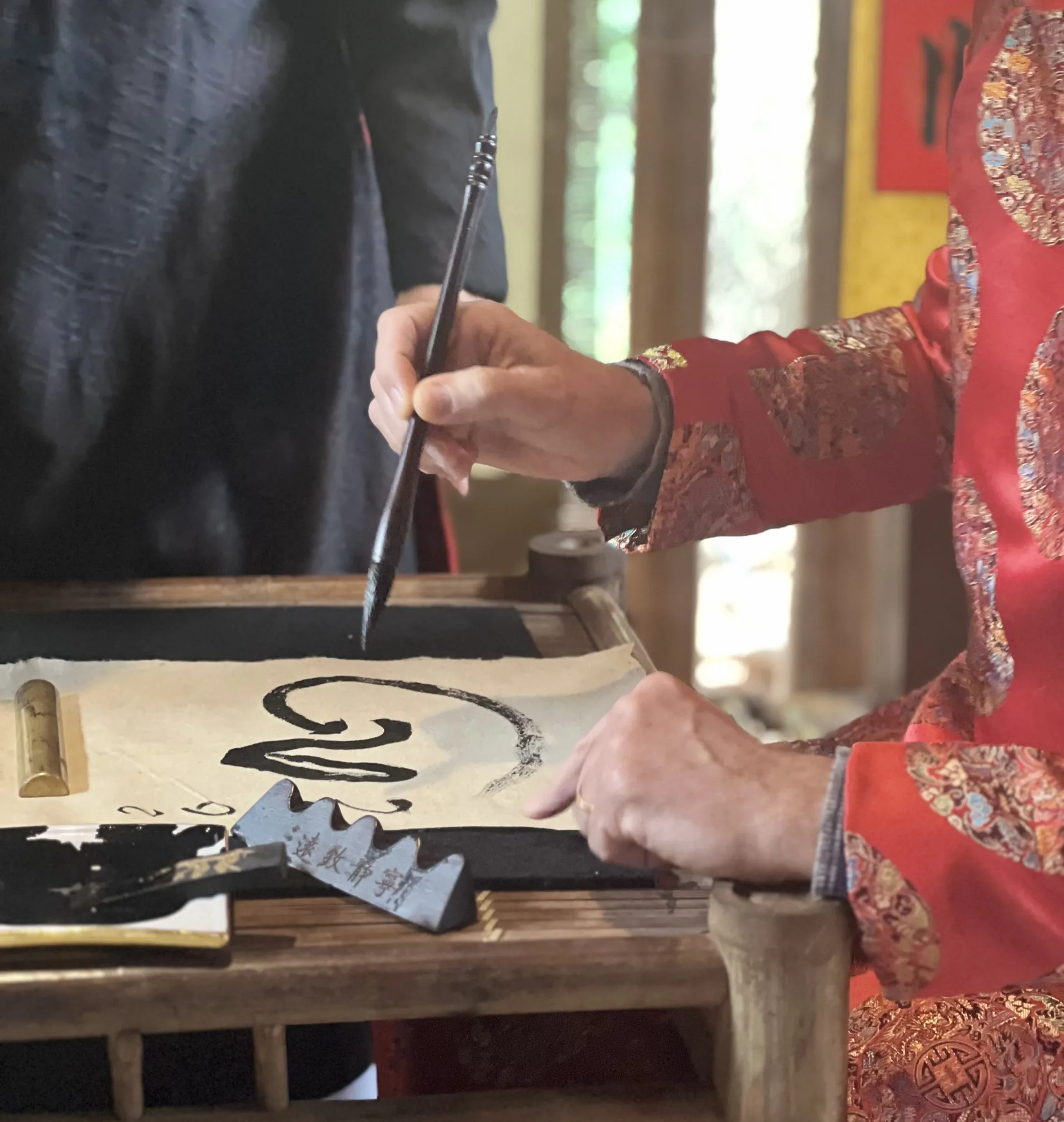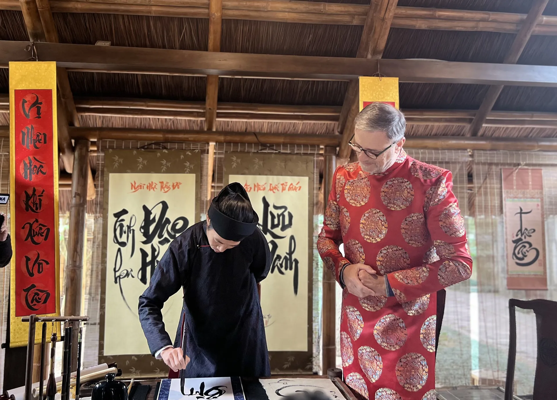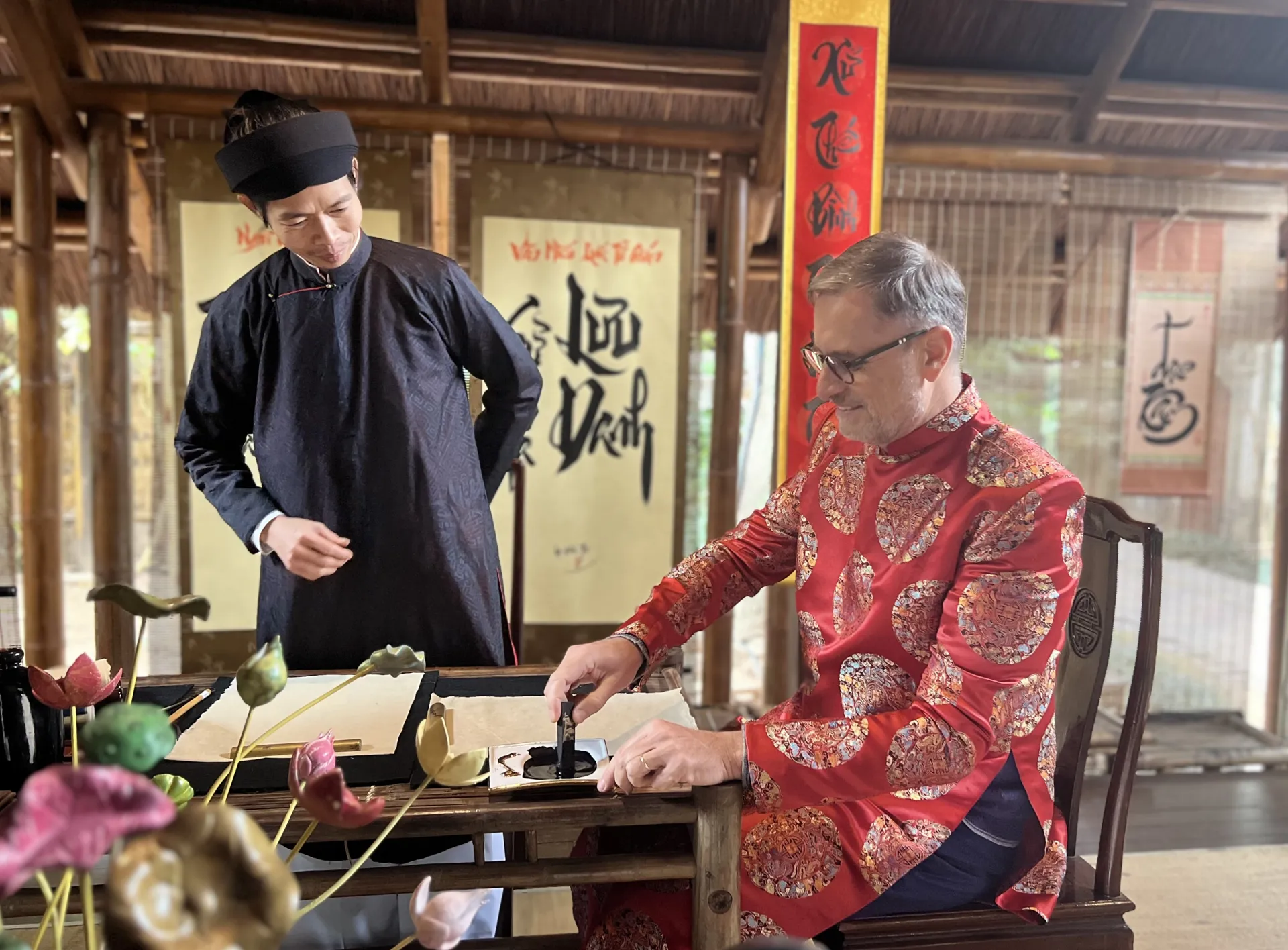 Đại sứ cũng có dịp trải nghiệm một số nét đẹp truyền thống của người Việt như xin chữ thầy đồ ngày Tết Nguyên đán. Ảnh: Liên Hà