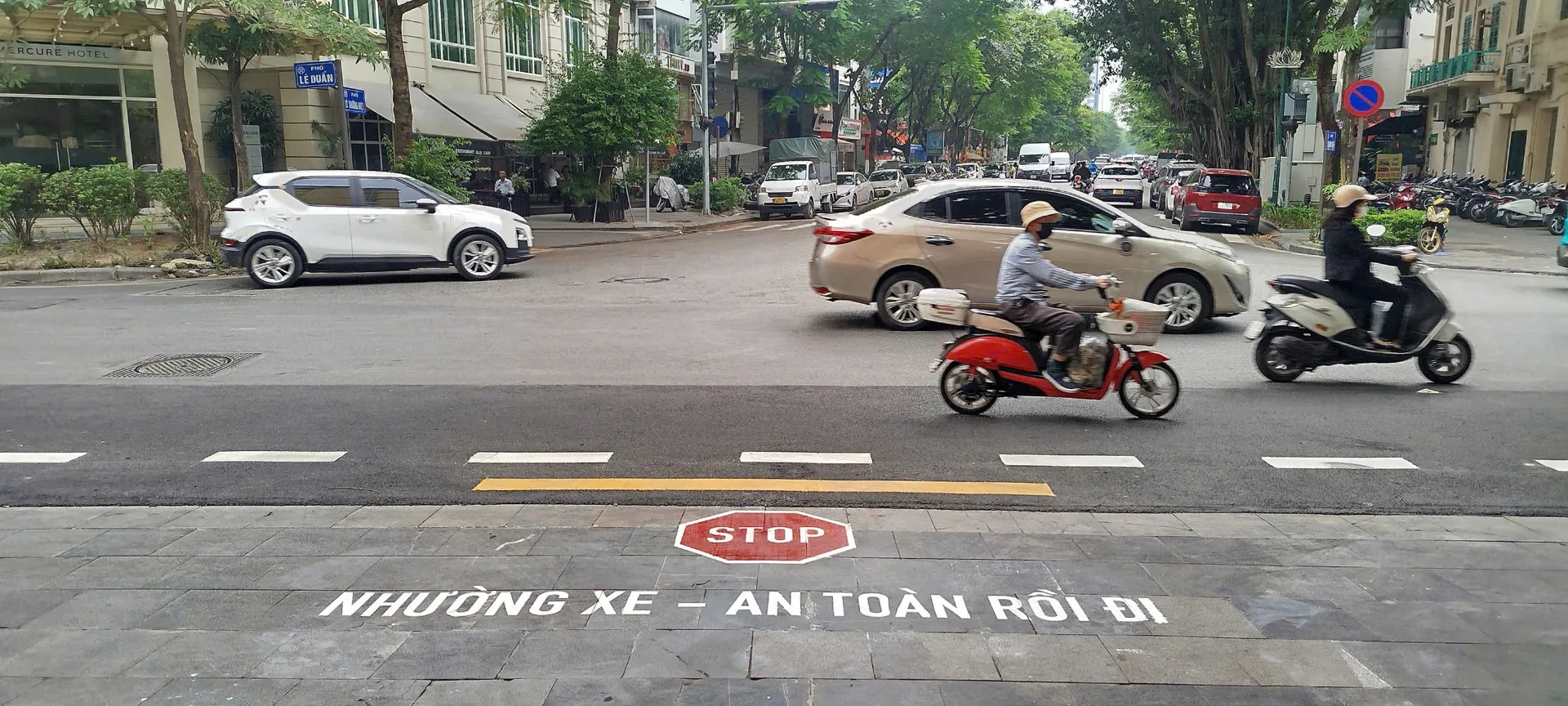 Khẩu hiệu và biển báo được sơn thí điểm trên đường Lê Duẩn, Hà Nội.