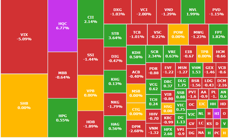 Ở chiều ngược lại, nhóm ngân hàng tiếp tục là lực cản khi VCB, TCB, BID, HDB và MBB đồng loạt giảm. Nhóm chứng khoán chịu áp lực mạnh với VIX giảm sâu 5,09%, kéo theo SSI, VCI, SHS và nhiều mã khác giảm theo.