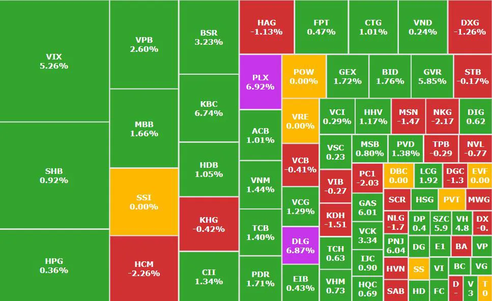 Ở nhóm vốn hóa lớn, đặc biệt là ngân hàng, xu hướng tăng không còn đồng thuận như những phiên trước, nhưng vẫn giữ vai trò nâng đỡ chỉ số. VPB tăng 2,6%, BID tăng 1,76%, trong khi CTG, ACB, TCB, MBB duy trì sắc xanh nhẹ. Ở chiều ngược lại, một số cổ phiếu trụ như VCB giảm 0,41%, cùng với MSN và SAB điều chỉnh nhẹ, tạo áp lực cục bộ lên thị trường nhưng chưa đủ lớn để làm đảo chiều xu hướng chung.
