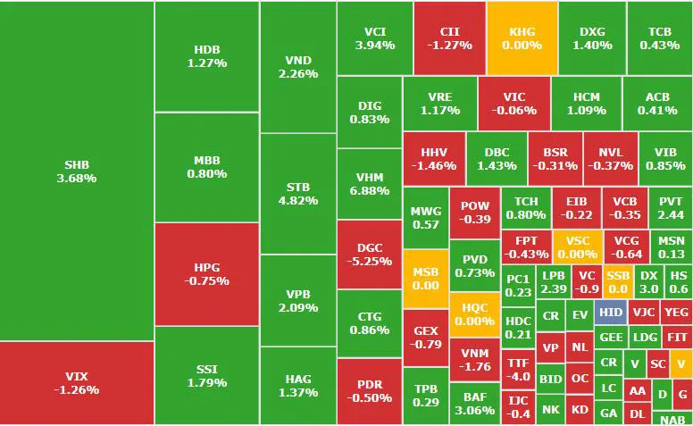 Sự hồi phục lan tỏa sang nhóm ngân hàng và bán lẻ cho thấy niềm tin thị trường đã phần nào được củng cố. Các cổ phiếu ngân hàng như STB, VPB, HDB hay nhóm bán lẻ với PNJ, MWG đồng loạt tăng giá không chỉ góp phần cải thiện điểm số mà còn giúp tâm lý giao dịch trở nên tích cực hơn trong những phút cuối phiên. Dù vậy, việc dòng tiền chỉ thực sự bùng lên về cuối phiên cũng cho thấy xu hướng tăng hiện tại vẫn cần thêm sự xác nhận trong các phiên tiếp theo, đặc biệt là về mặt thanh khoản và độ lan tỏa trên toàn thị trường.