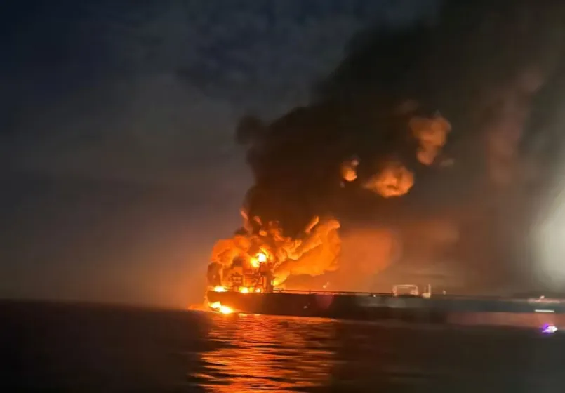 Lửa và cột khói dày bốc lên sau khi hai tàu thuộc “hạm đội trong bóng tối” của Nga bị tấn công ở Biển Đen, ngày 28/11. Ảnh: Tổng cục Hàng hải Thổ Nhĩ Kỳ.