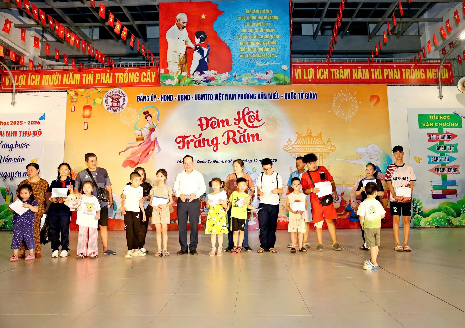 Trong khi đó, chương trình “Đêm hội Trăng Rằm” cho các em thiếu nhi trên địa bàn phường Văn Miếu - Quốc Tử Giám diễn ra sôi nổi với nhiều tiết mục nghệ thuật đặc sắc như múa lân, văn nghệ, xiếc, trò chơi dân gian, trưng bày mâm cỗ Trung thu… Đặc biệt, các em thiếu nhi được nghe đọc thư chúc Tết Trung thu của Chủ tịch nước, cùng nhau phá cỗ, vui hội trăng rằm trong không khí ấm áp, đoàn kết. Trong khuôn khổ chương trình, Ban tổ chức trao tặng nhiều phần quà ý nghĩa cho các em nhỏ.