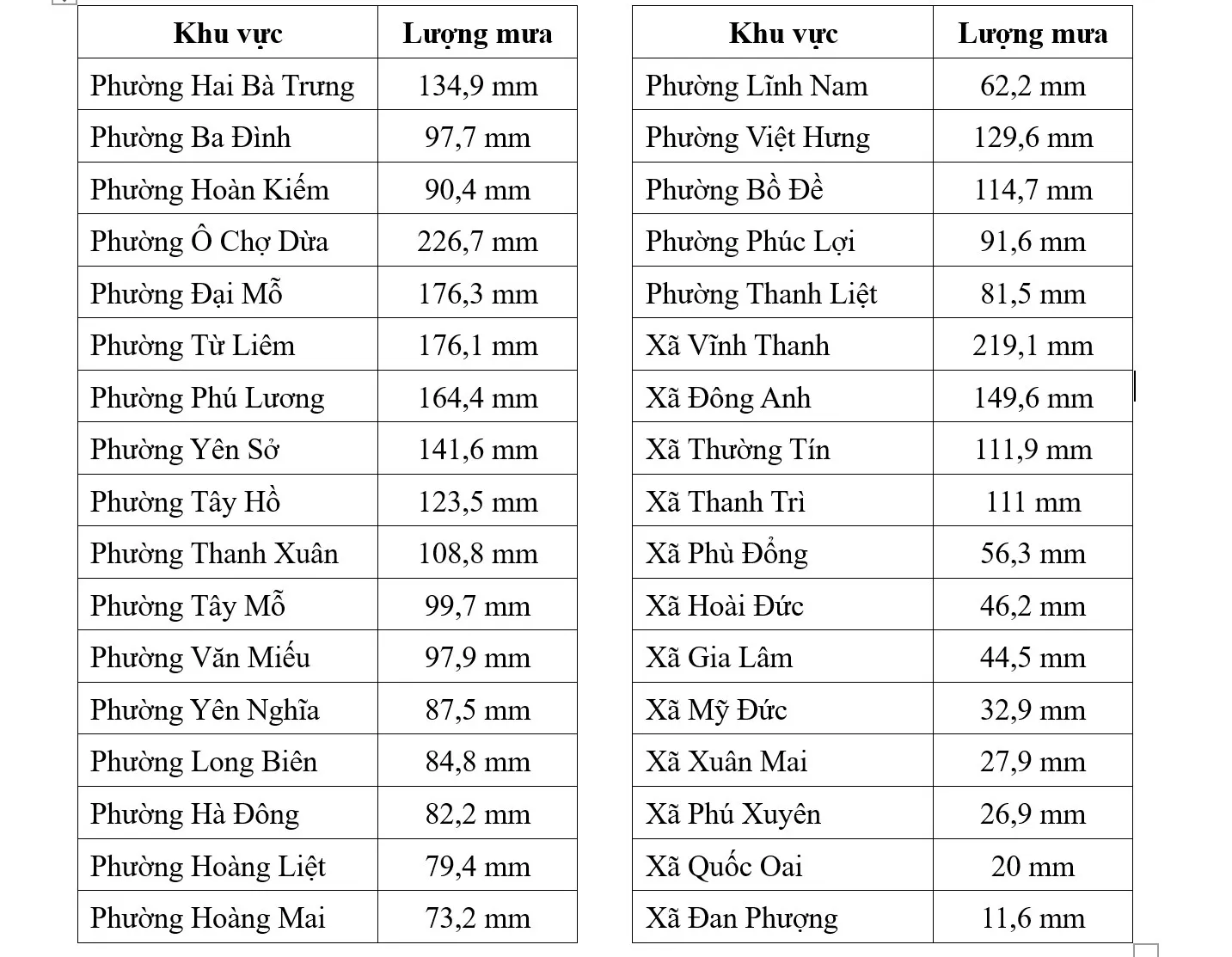 Lượng mưa đo được tại các điểm đo trên địa bàn TP Hà Nội.