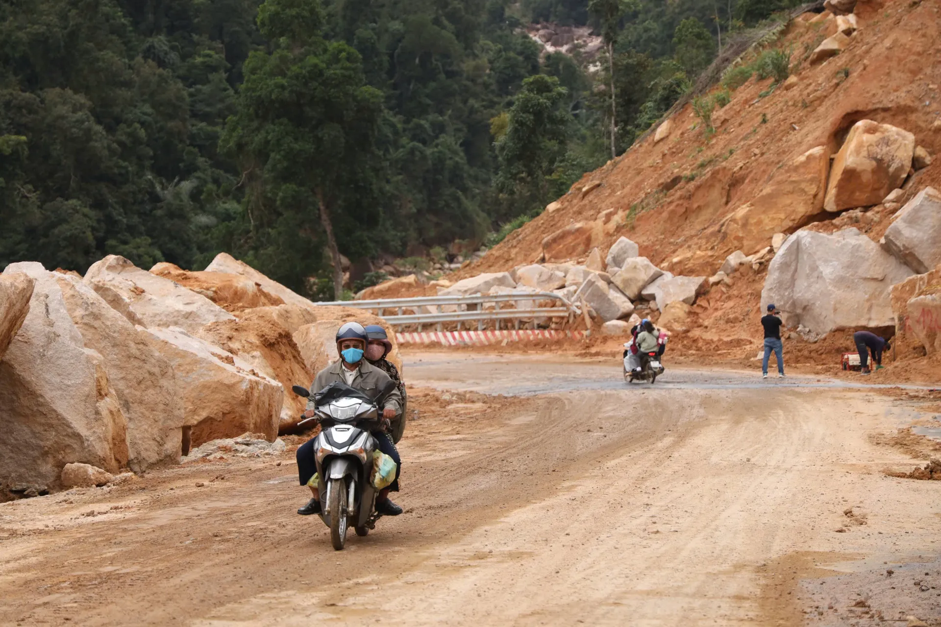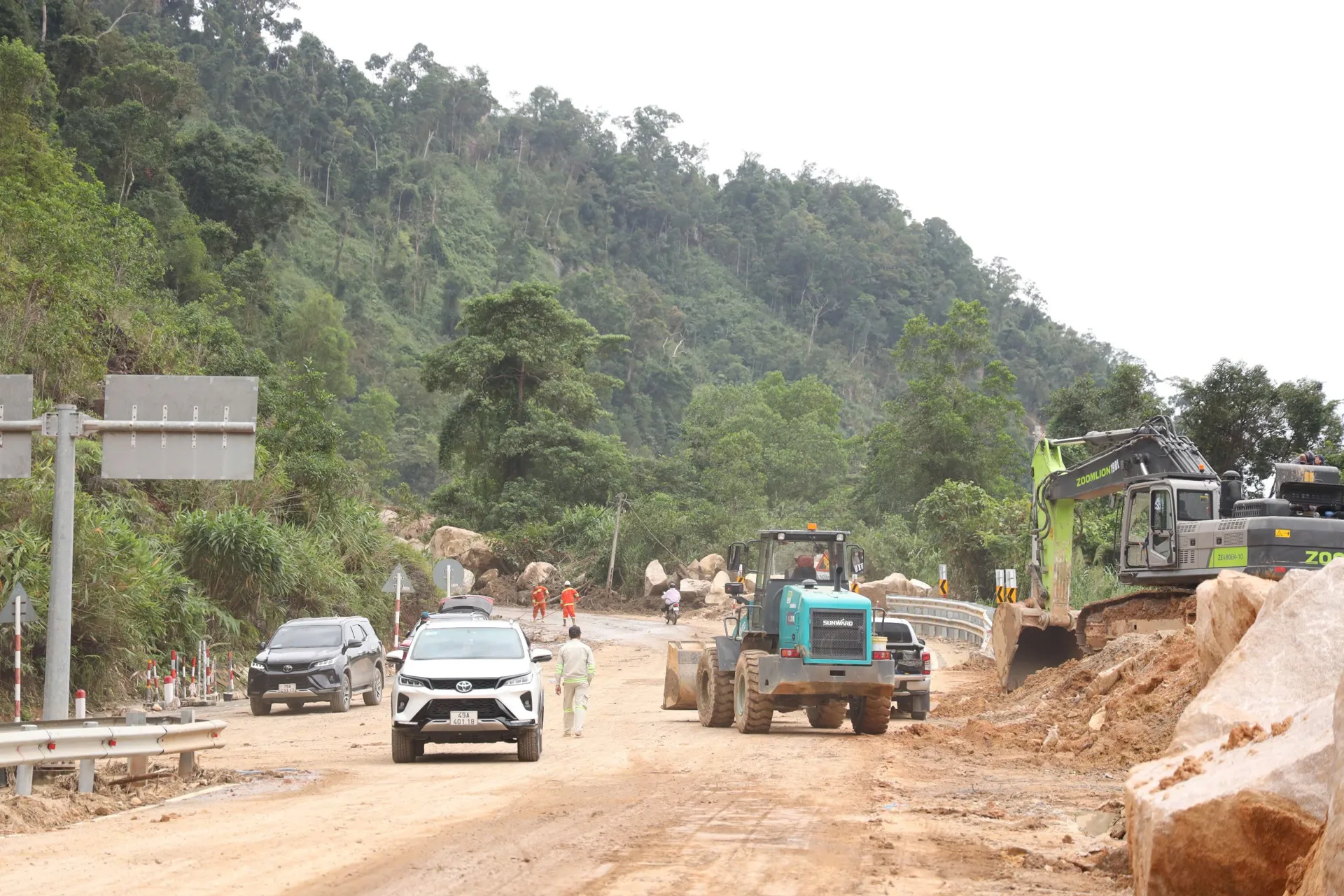 Để sớm thông tuyến, các công nhân bám trụ công trường, mỗi ngày làm việc sáng sớm đến hơn 21 giờ, vừa phải phá đá các điểm tắc nghẽn, vừa dọn dẹp mặt đường, trong điều kiện thời tiết liên tục mưa khiến khối lượng công việc không ngừng phát sinh.