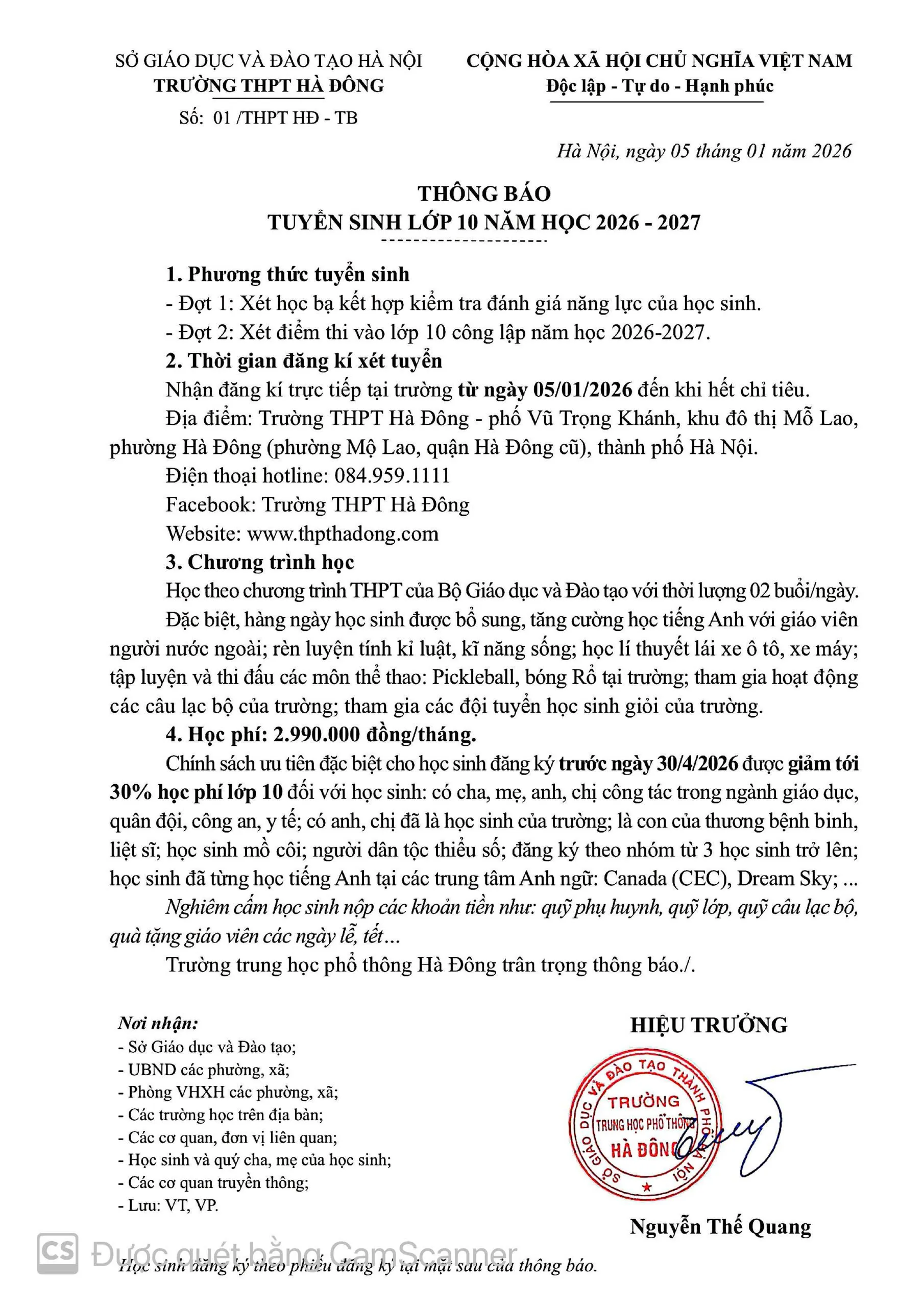 Thông báo tuyển sinh năm học 2026 - 2027 của Trường THPT Hà Đông.