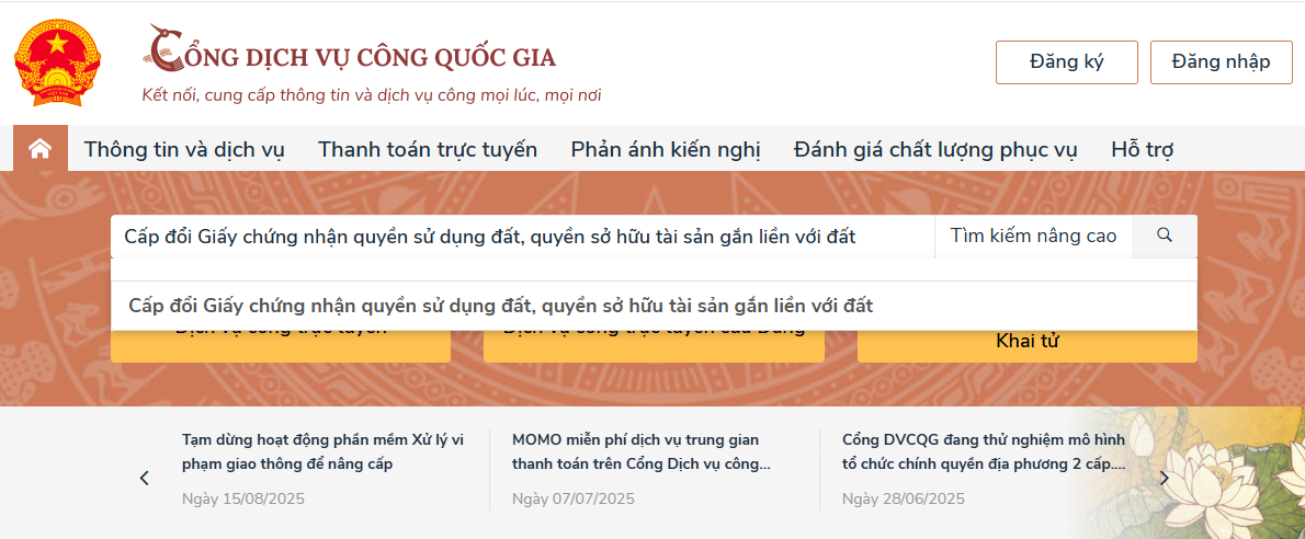 Để thực hiện thủ tục “Cấp đổi Giấy chứng nhận quyền sử dụng đất, quyền sở hữu tài sản gắn liền với đất”, trên Cổng Dịch vụ công Quốc gia.