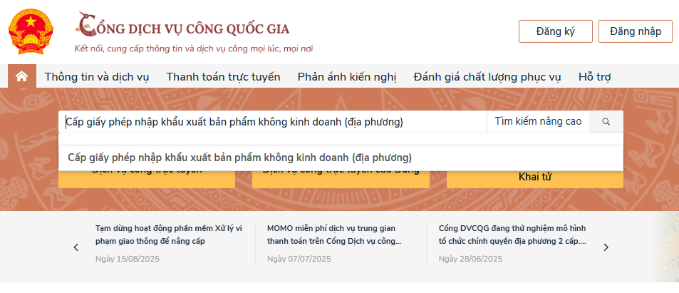 Dưới đây là hướng dẫn thực hiện trực tuyến trên Cổng Dịch vụ công Quốc gia thủ tục "Cấp giấy phép nhập khẩu xuất bản phẩm không kinh doanh".