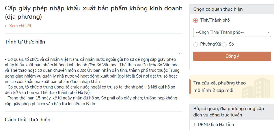 Mục "Cơ quan thực hiện": Ở ví dụ này, công dân chọn "Thành phố Hà Nội", chọn "Xã Gia Lâm" và nhấn nút "Đồng ý". Tiếp theo, trên màn hình xuất hiện dịch vụ "Cấp giấy phép nhập khẩu xuất bản phẩm không kinh doanh (địa phương)", công dân nhấn vào ô "Nộp trực tuyến" để tiếp tục.