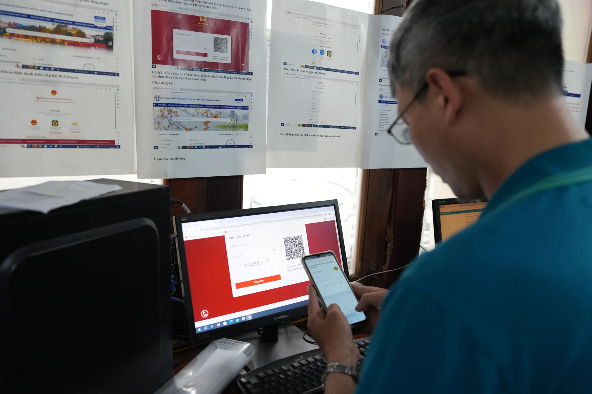 Công dân đang kết nối đăng nhập tài khoản trên Cổng Dịch vụ Công Quốc gia. Ảnh: Công Phương.