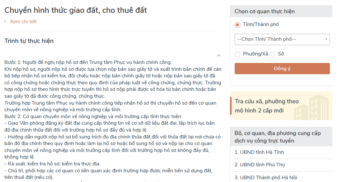 - Công dân nhập từ khóa: “chuyển hình thức giao đất, cho thuê đất" vào thanh tìm kiếm để tìm thủ tục hành chính