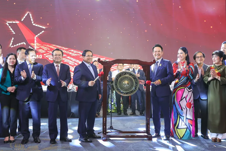 Thủ tướng và Chủ tịch VPFS 2025 cùng các doanh nhân thực hiện nghi thức đánh cồng, chính thức khởi động một giai đoạn phát triển mới của khu vực kinh tế tư nhân Việt Nam - Ảnh: VGP/Nhật Bắc