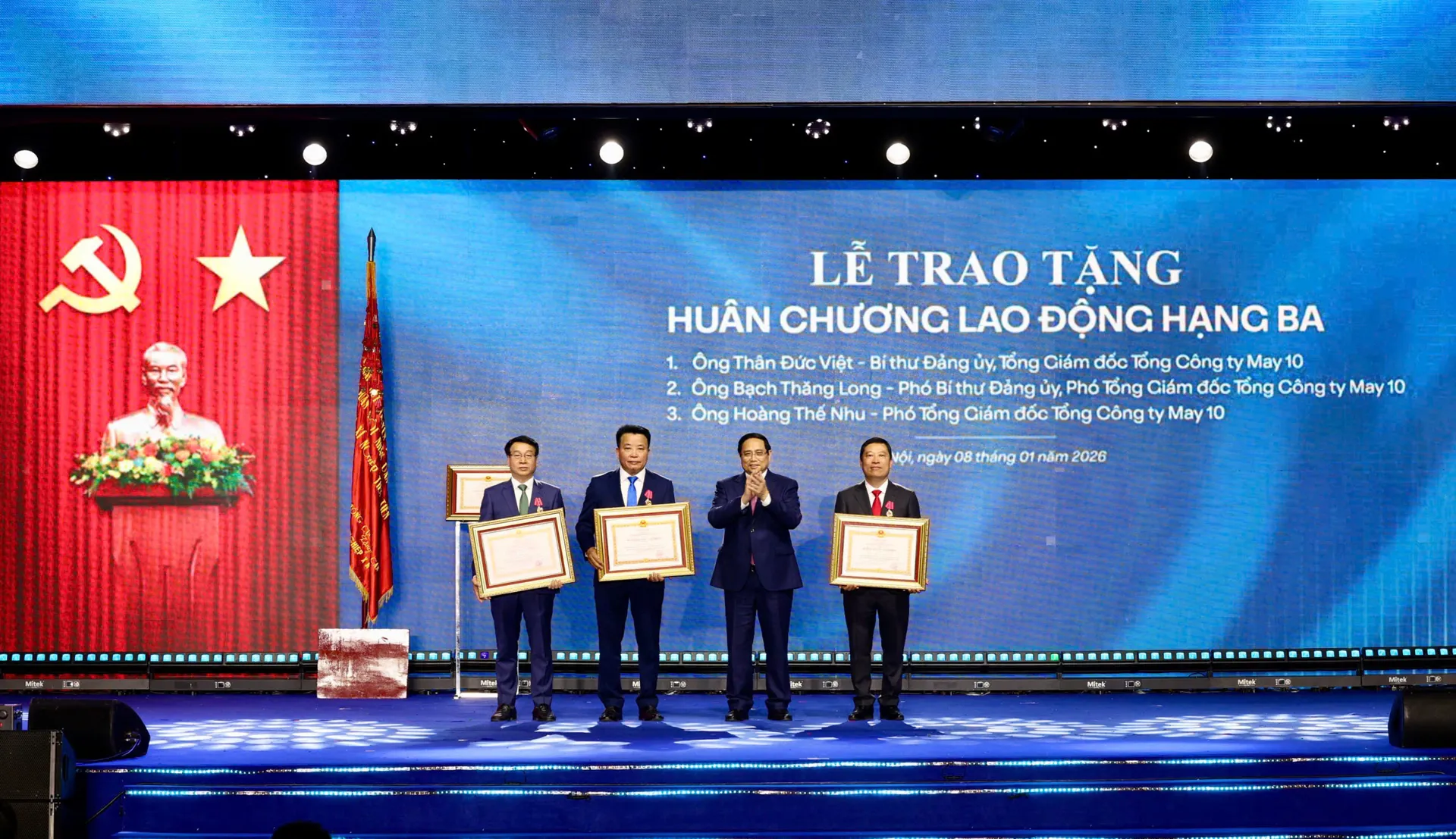 Thay mặt Đảng và Nhà nước, Thủ tướng Chính phủ trao Huân chương Lao động hạng Nhất tặng Tổng công ty May 10. Ảnh: Duy Khánh