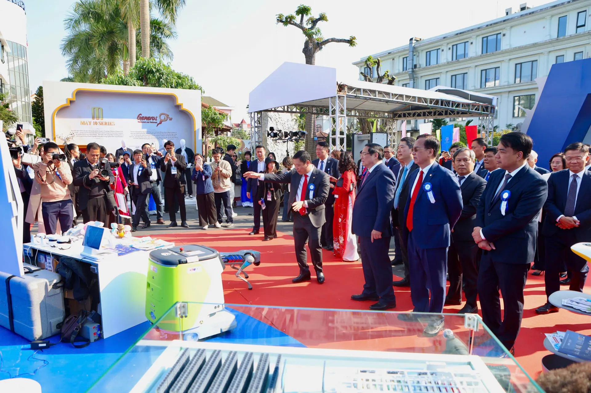 Thủ tướng Phạm Minh Chính xem trình diễn công nghệ để ứng dụng vào sản xuất, kinh doanh. Ảnh: Duy Khánh