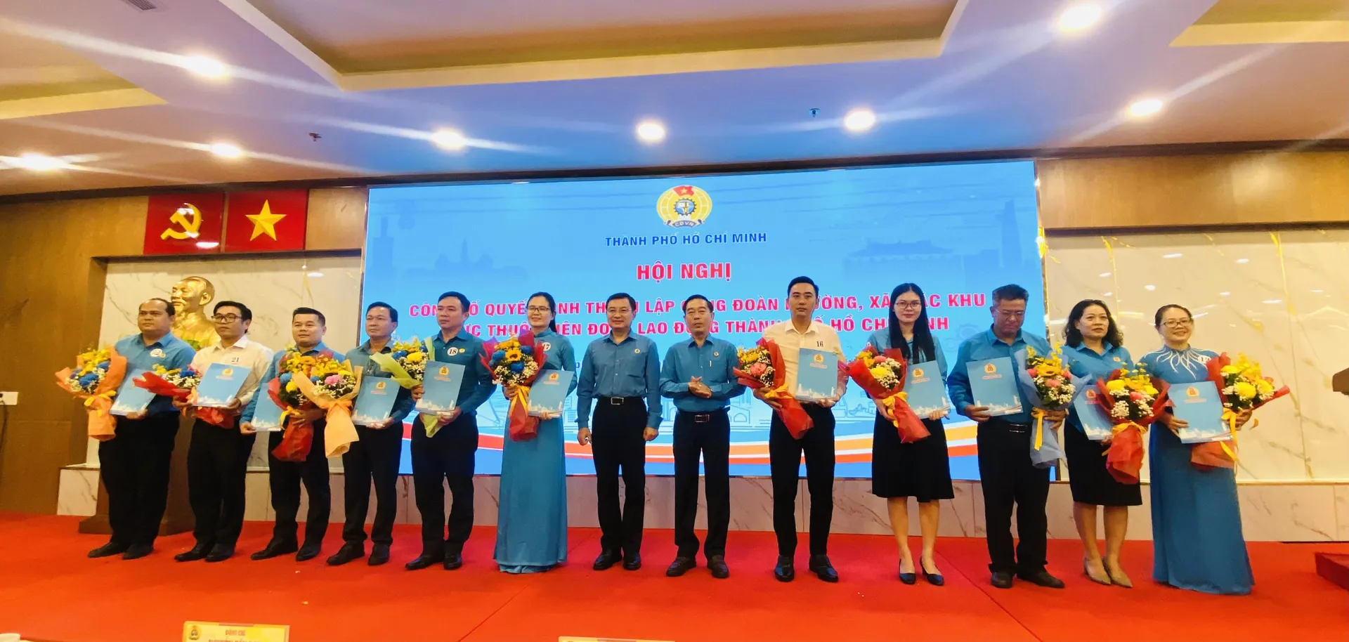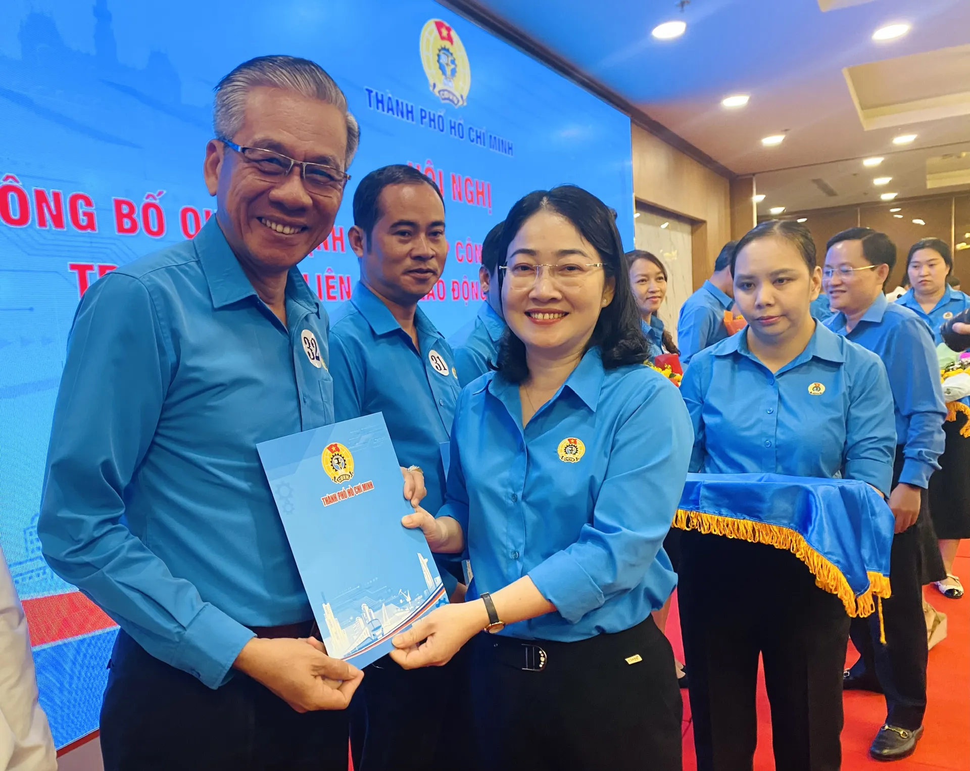 Phó Chủ tịch Liên đoàn Lao động TP Hồ Chí Minh Nguyễn Thị Kim Loan trao quyết định cho các Chủ tịch Công đoàn phường, xã. Ảnh minh họa