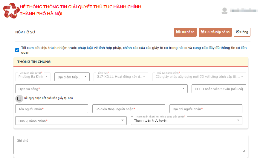 - Khi thực hiện nộp trực tuyến, hệ thống chuyển qua Cổng dịch vụ công Hà Nội (https://dichvucong.hanoi.gov.vn/) để nộp hồ sơ