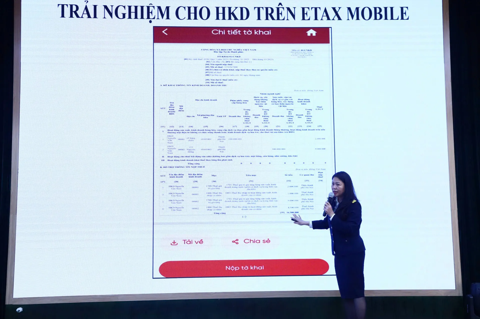 Tại hội nghị, HKD còn được nghe các ngân hàng thương mại, nhà cung cấp giải giáp trao đổi về lợi ích khi chuyển đổi số trong hoạt động kinh doanh để thay thế cho hoạt động kinh doanh truyền thống. Sau cùng, HKD được trải nghiệm kê khai thuế trên ứng dụng eTax Mobile với tính năng “Trải nghiệm cho hộ, cá nhân kinh doanh”.