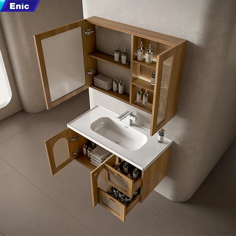 Tủ lavabo mây đan Enic được thiết kế với hệ thống ngăn tủ khoa học, tối ưu hóa không gian lưu trữ. Các ngăn tủ được bố trí hợp lý, giúp người dùng dễ dàng sắp xếp và cất giữ đồ dùng cá nhân như khăn tắm, mỹ phẩm, hoặc các vật dụng vệ sinh khác.