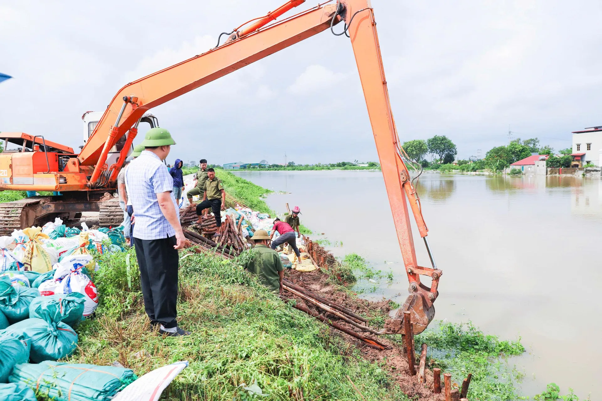 Để bảo vệ tuyến đê sông Nhuệ, bảo đảm an toàn cho Nhân dân địa phương, xã Thượng Phúc đã huy động người dân cùng với các lực lượng vũ trang, dân quân tự vệ, đoàn viên trên địa bàn khẩn trương đóng cọc, dùng bao cát gia cố điểm bị sạt lở.