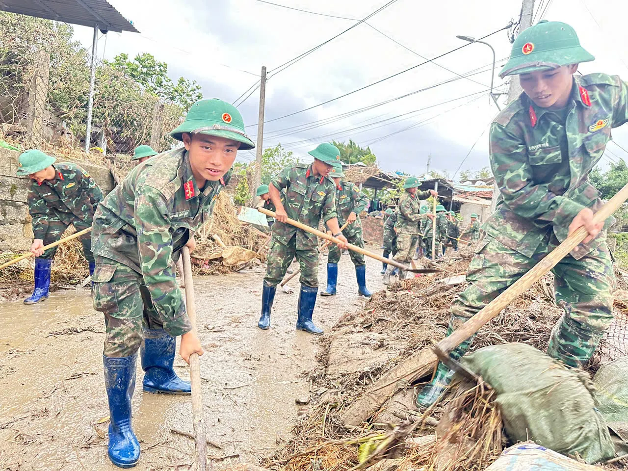 Thượng sĩ kiệt cùng đồng đội dọn dẹp giúp dân sau lũ lụt.