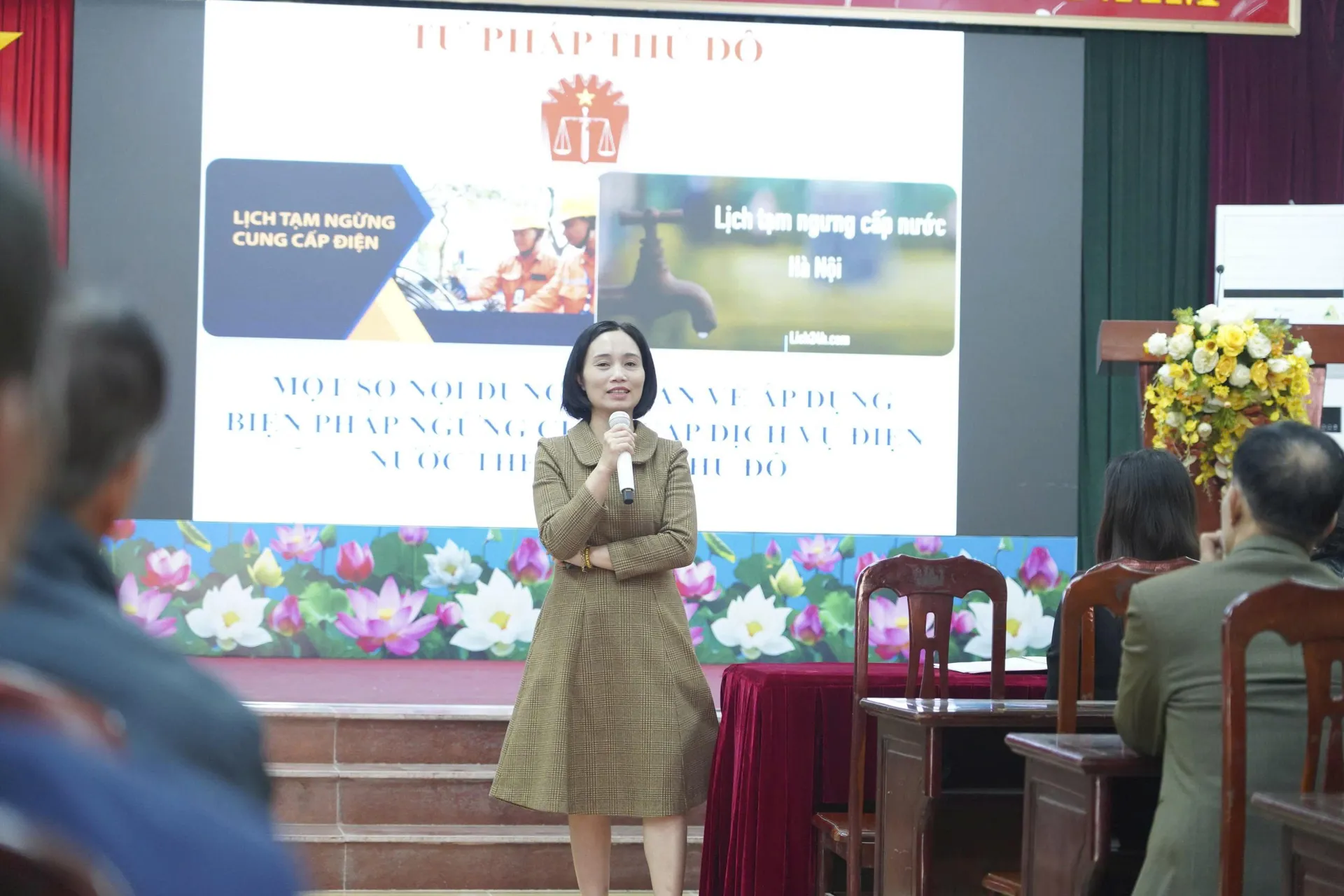 Phó Trưởng phòng Hành chính Tư pháp (Sở Tư pháp thành phố Hà Nội) Nguyễn Thị Bích Thủy truyền đạt nội dung trọng tâm là kỹ năng áp dụng các quy định về biện pháp yêu cầu ngừng cung cấp dịch vụ điện, nước theo Nghị quyết số 33/2024/HĐND của HĐND thành phố Hà Nội...
