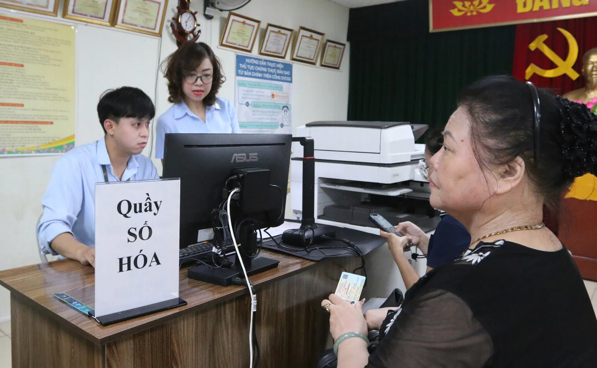 Nhân viên TTPVHCC hỗ trợ công dân số hóa thủ tục hành chính. Ảnh: Công Phương.