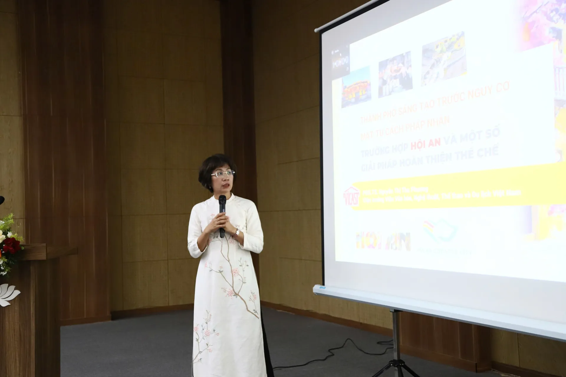 Đáng chú ý, PGS.TS Nguyễn Thị Thu Phương trình bày tham luận về "Thành phố sáng tạo trước nguy cơ mất tư cách pháp nhân - Trường hợp Hội An và một số giải pháp hoàn thiện thể chế". Trên cơ sở phân tích và đề xuất mô hình trường hợp Đô thị sáng tạo Hội An, PGS.TS Nguyễn Thị Thu Phương đã chỉ ra khoảng trống thể chế phát sinh trong quá trình chuyển đổi mô hình chính quyền hai cấp và nguy cơ đánh mất tư cách pháp nhân văn hoá quốc tế.