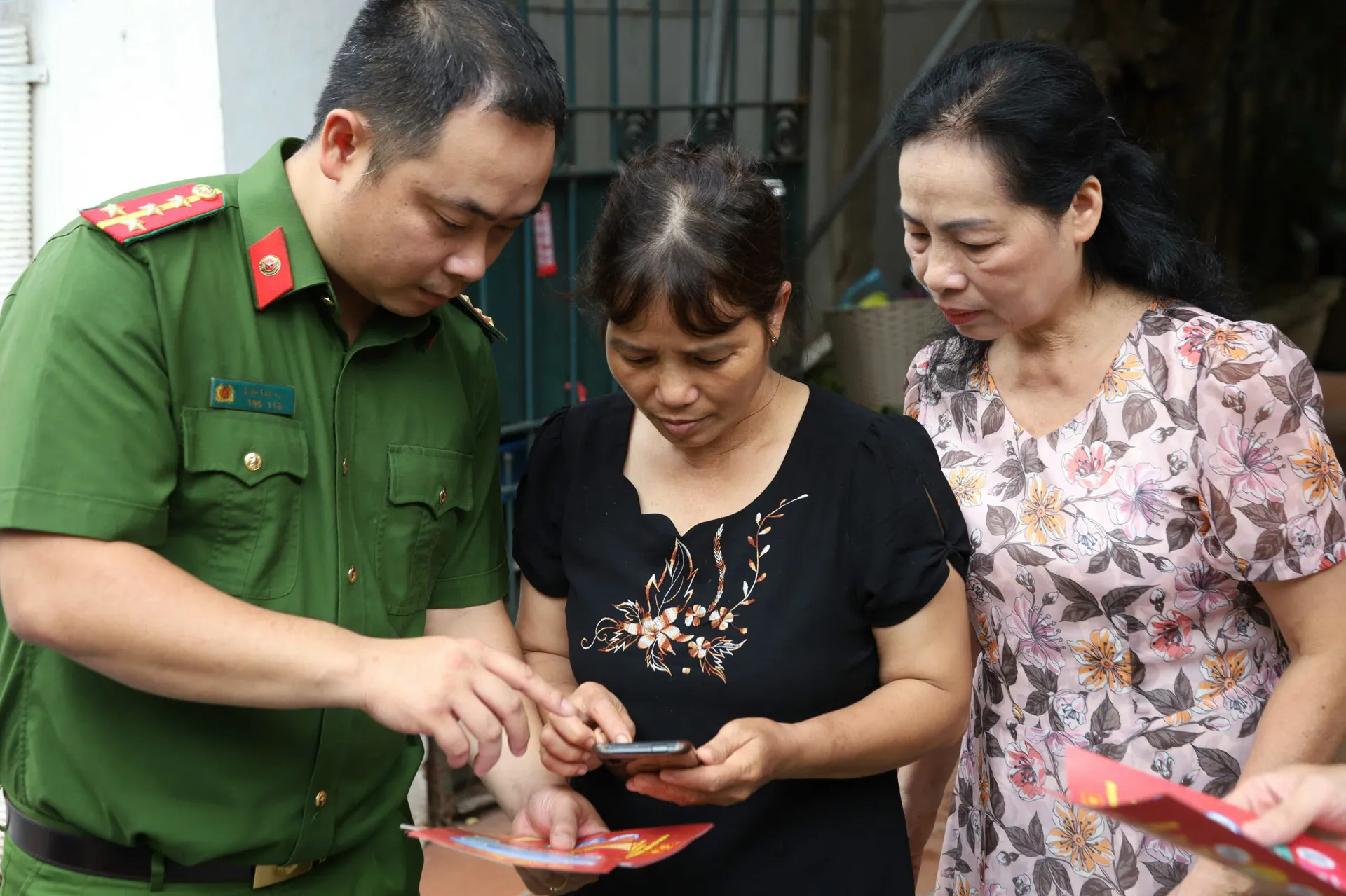 Lực lượng công an hướng dẫn người dân cài đặt dịch vụ công trên điện thoại di động. Ảnh: Bảo Hiếu.