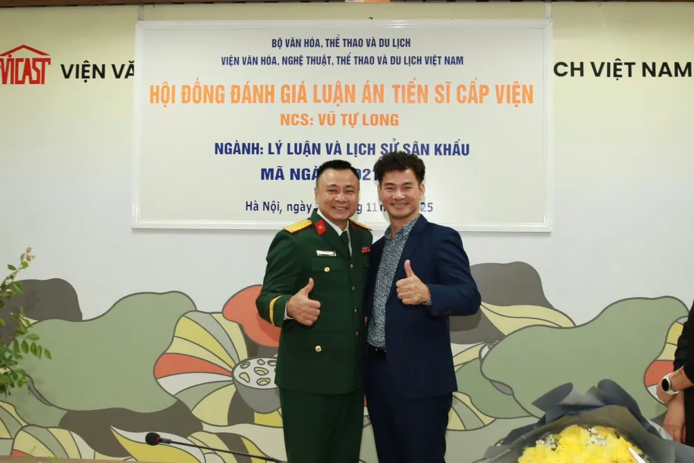 NSND Xuân Bắc chúc mừng NSND Tự Long bảo vệ thành công luận án Tiến sĩ. Ảnh: Nhân vật cung cấp.