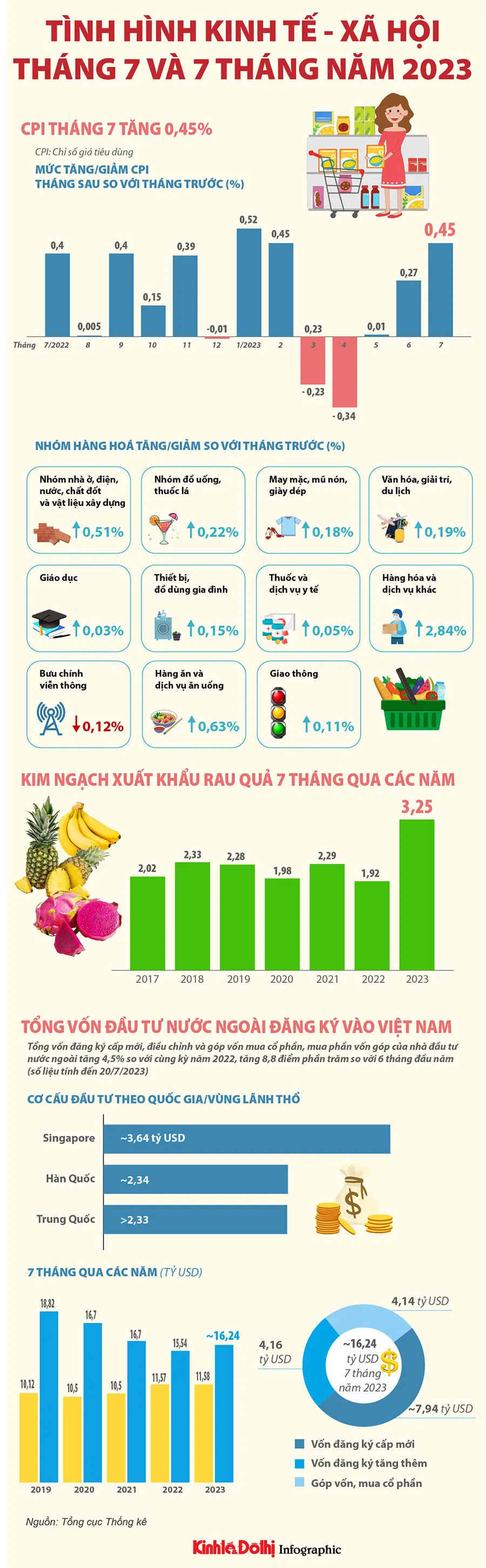 Kinhtedothi - Cục Thống kê TP Hà Nội cho biết, CPI tháng 7/2023 tăng 0,44% so với tháng trước, tăng 0,51% so với tháng 12/2022 và giảm 0,4% so với cùng kỳ năm trước. CPI bình quân 7 tháng tăng 0,99% so với bình quân cùng kỳ năm trước.