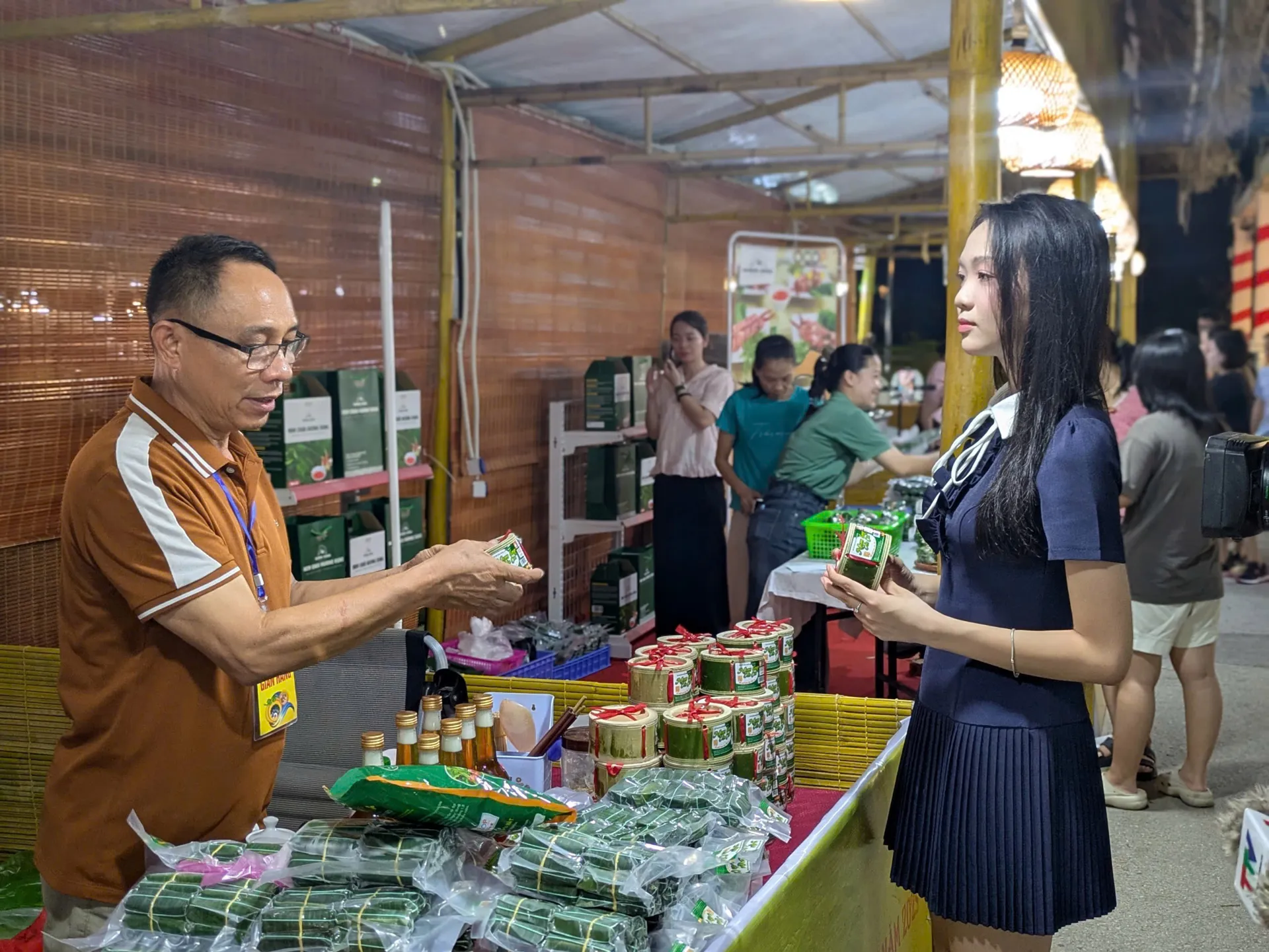 Đến từ vùng Tây Bắc, chị Lò Thị Nhung, đại diện gian hàng của tỉnh Điện Biên, cho biết: “Tỉnh Điện Biên mang đến nhiều sản phẩm đặc trưng, đặc biệt là ẩm thực của đồng bào dân tộc Thái. Gian hàng giới thiệu những món nổi tiếng như xôi tím (xôi nếp nương), thịt trâu gác bếp, thịt lợn gác bếp, lợn băm cuốn lá chuối nướng, thịt xiên nướng từ lợn đen, măng nhồi thịt nướng, cùng chẩm chéo và nhiều đặc sản khác của địa phương. Những ngày qua, gian hàng Điện Biên luôn đông khách đến tham quan, mua sắm và thưởng thức. Chúng tôi phục vụ từ 7 giờ sáng đến 22 giờ đêm, ai đến cũng muốn nếm thử, chụp ảnh lưu niệm, không khí rất vui và ấm cúng.”