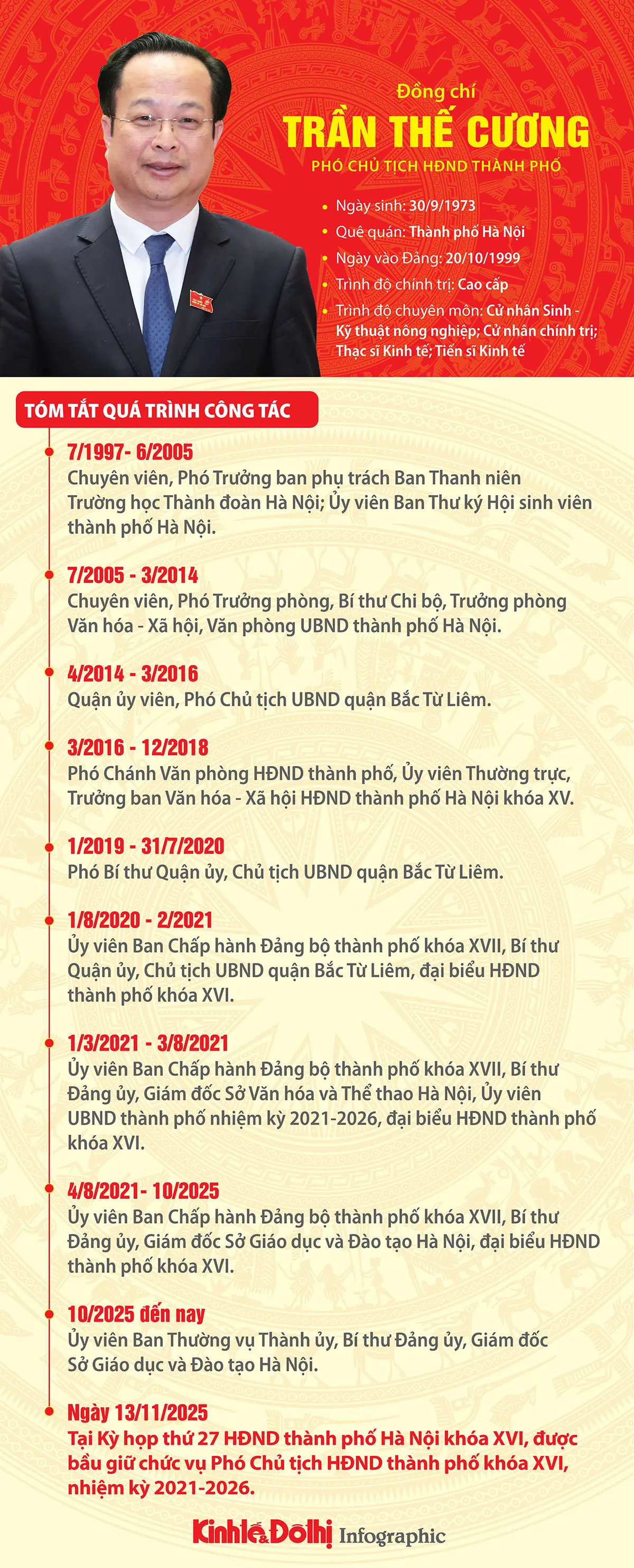 Kinhtedothi - Chiều 13/11/2025, tại Kỳ họp lần thứ 27 của HĐND TP Hà Nội khóa XVI, với 100% đại biểu có mặt tán thành, đồng chí Trần Thế Cương, Ủy viên Ban Thường vụ Thành ủy, Giám đốc Sở Giáo dục - Đào tạo Hà Nội được bầu giữ chức Phó Chủ tịch HĐND TP Hà Nội nhiệm kỳ 2021- 2026.