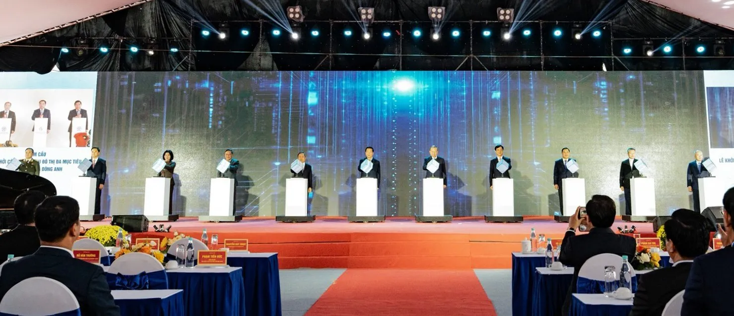Tổng Bí thư Tô Lâm và các đại biểu T.Ư, TP Hà Nội thực hiện nghi thức nhấn nút khởi công Dự án Khu đô thị đa mục tiêu Bắc Thăng Long Urban City